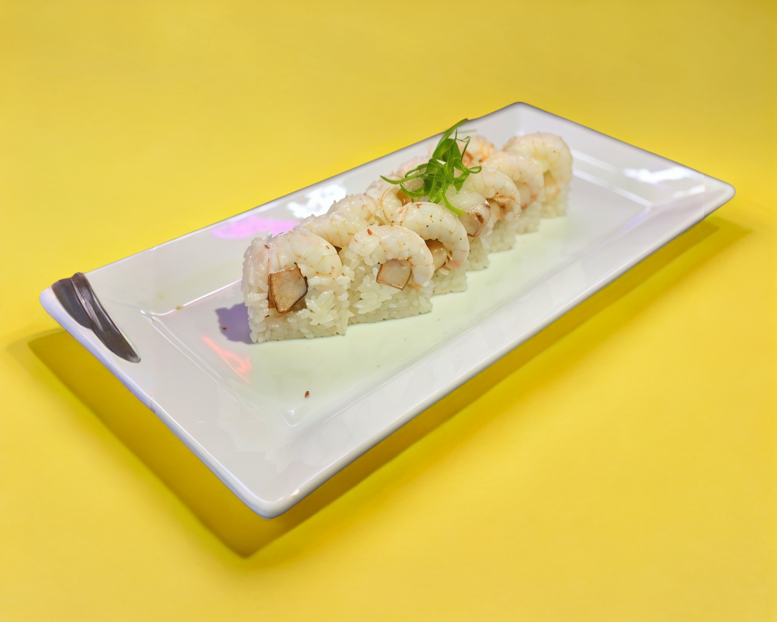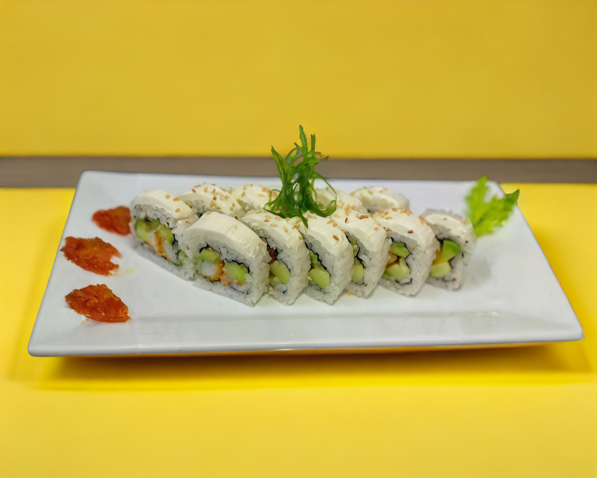 relleno con aguacate, camarón empanizado forrado con queso crema y tampico arriba
