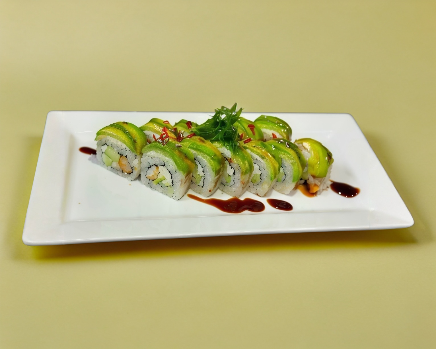 relleno con queso crema, pepino, cangrejo empanizado en vuelto en aguacate con puntos de shirasha y ajonjoli