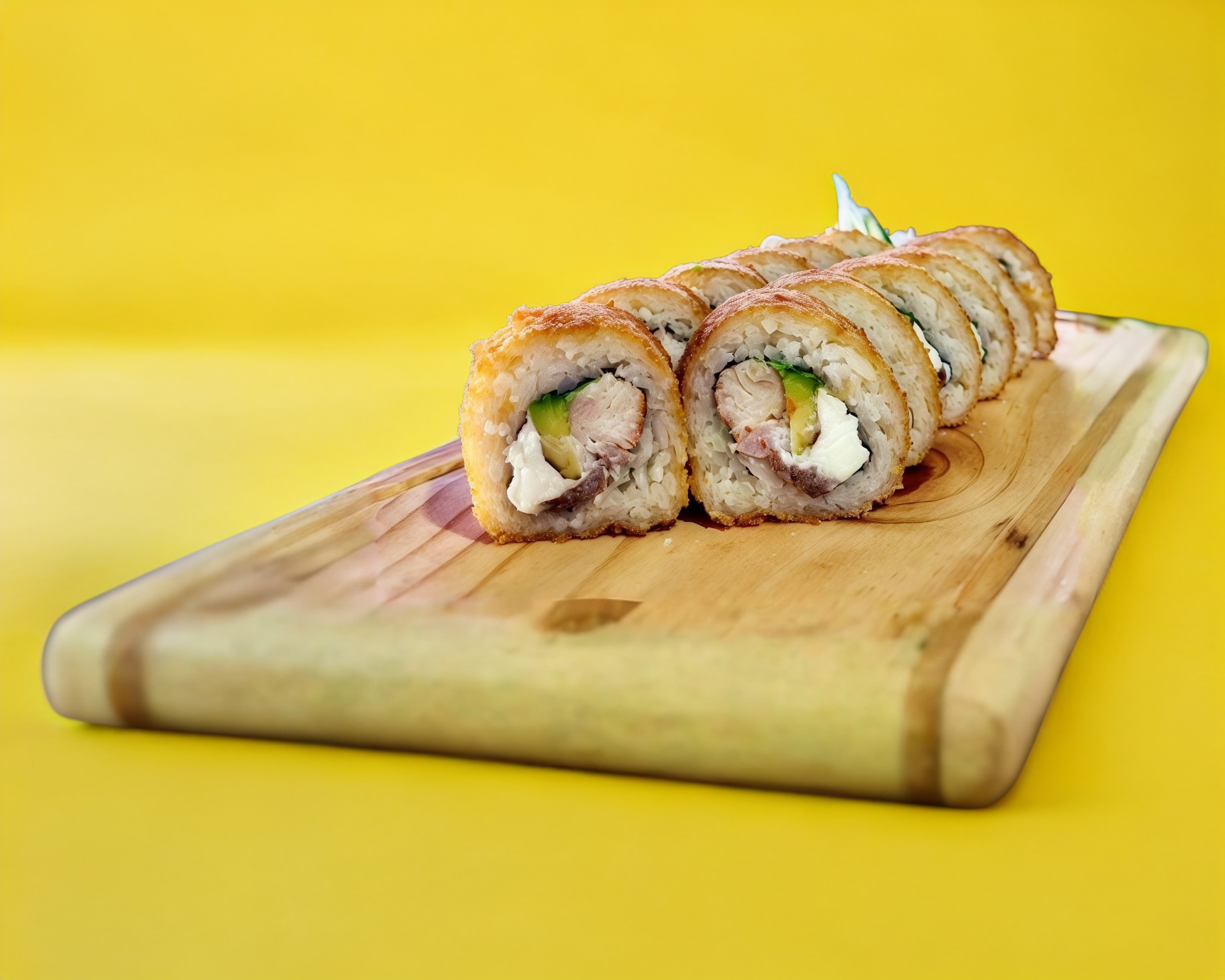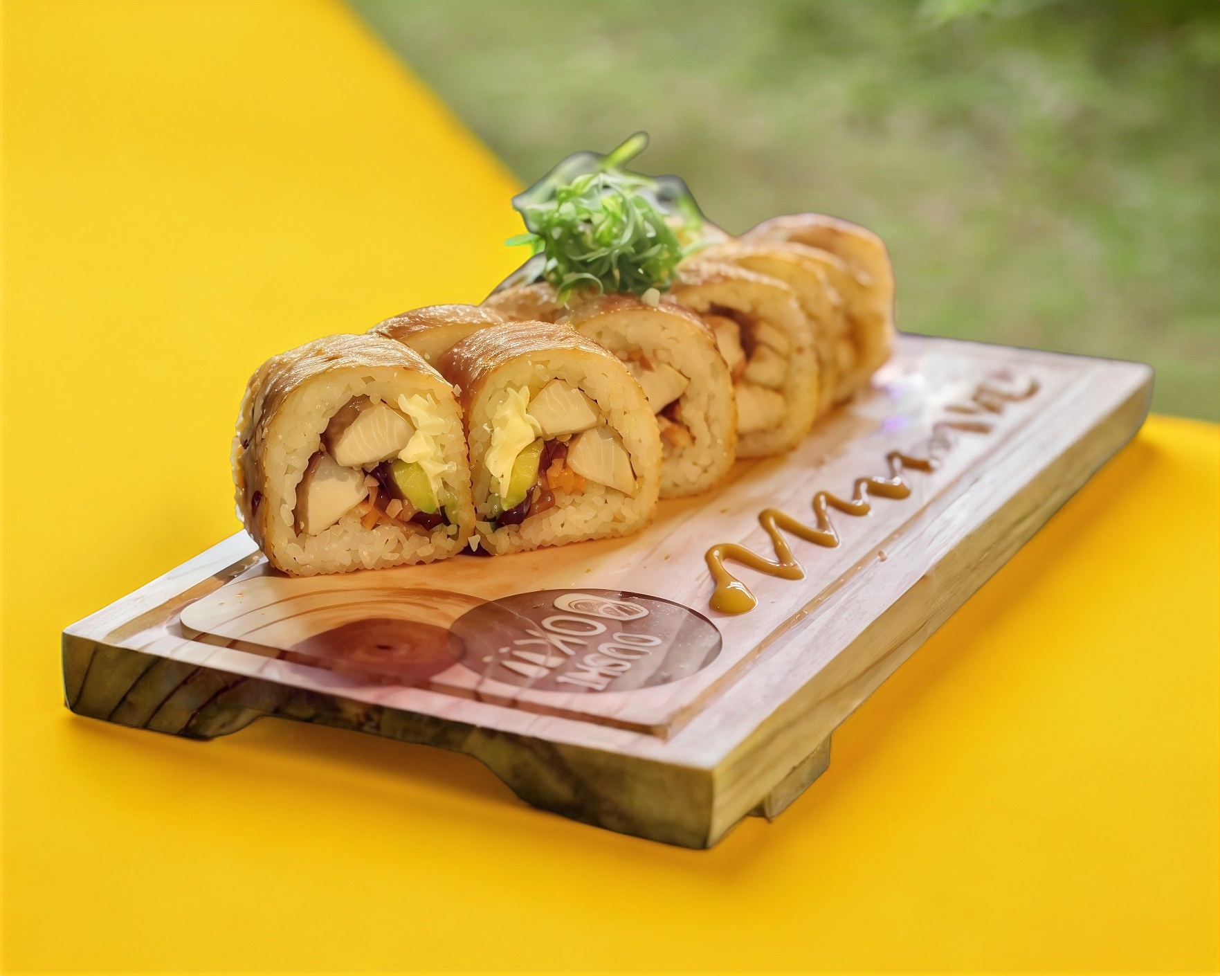 sushi bomba empanizada rellena con queso crema, proteína a escoger y por fuera gratinada, coronada con tampico y aguacate