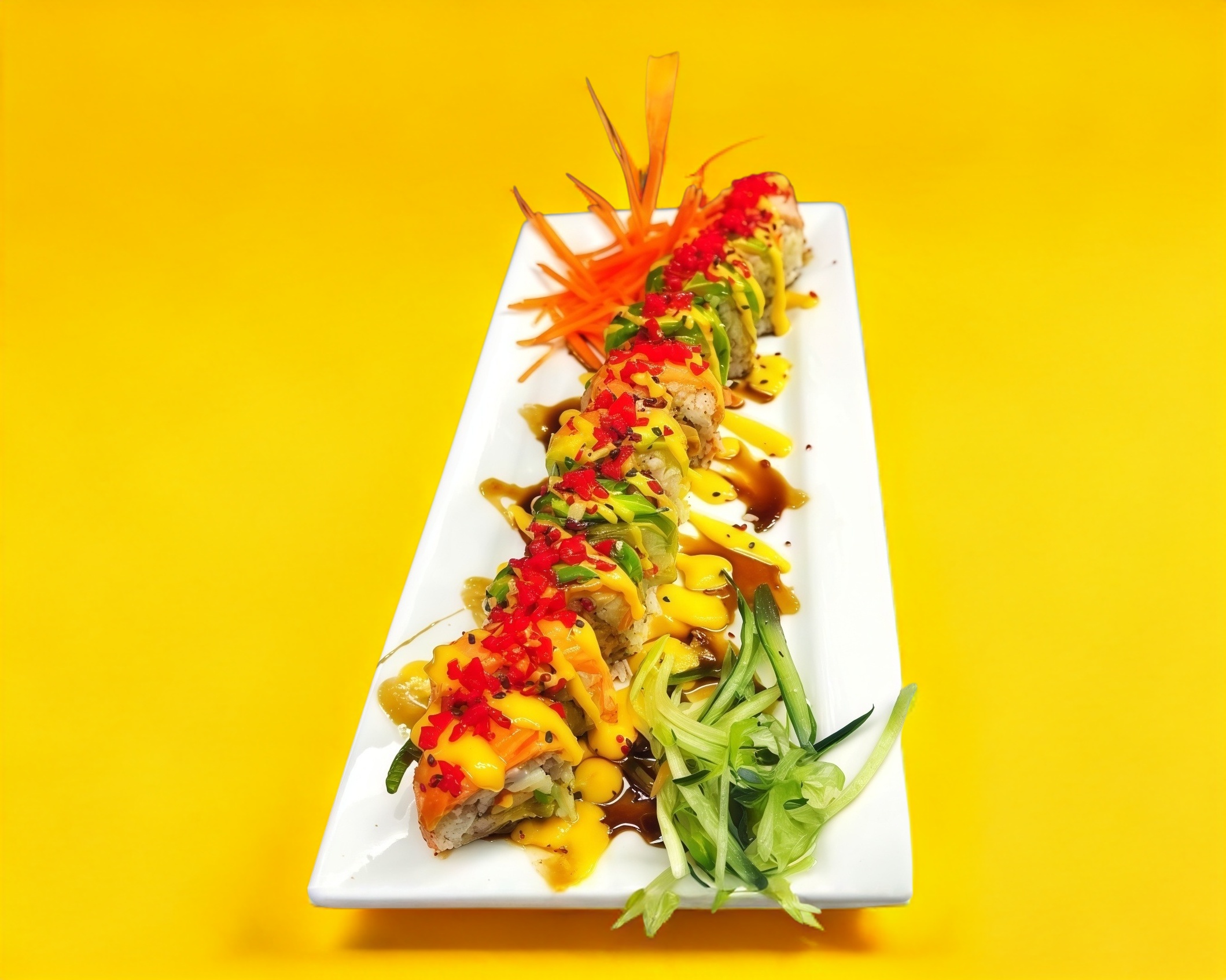 relleno con queso crema, pepino, aguacate y zanahoria capeadas envuelto en mango bañado en salsa dulce