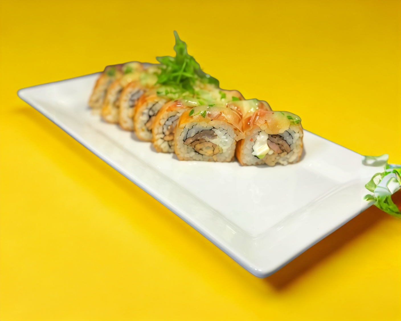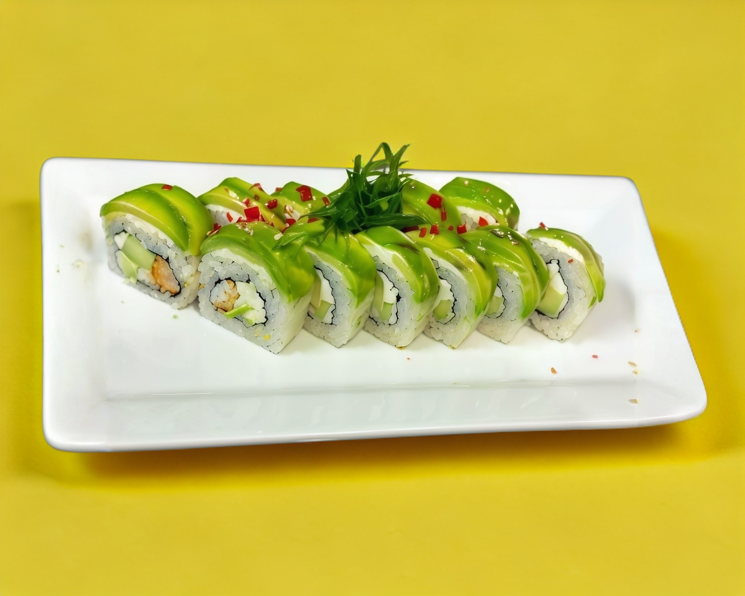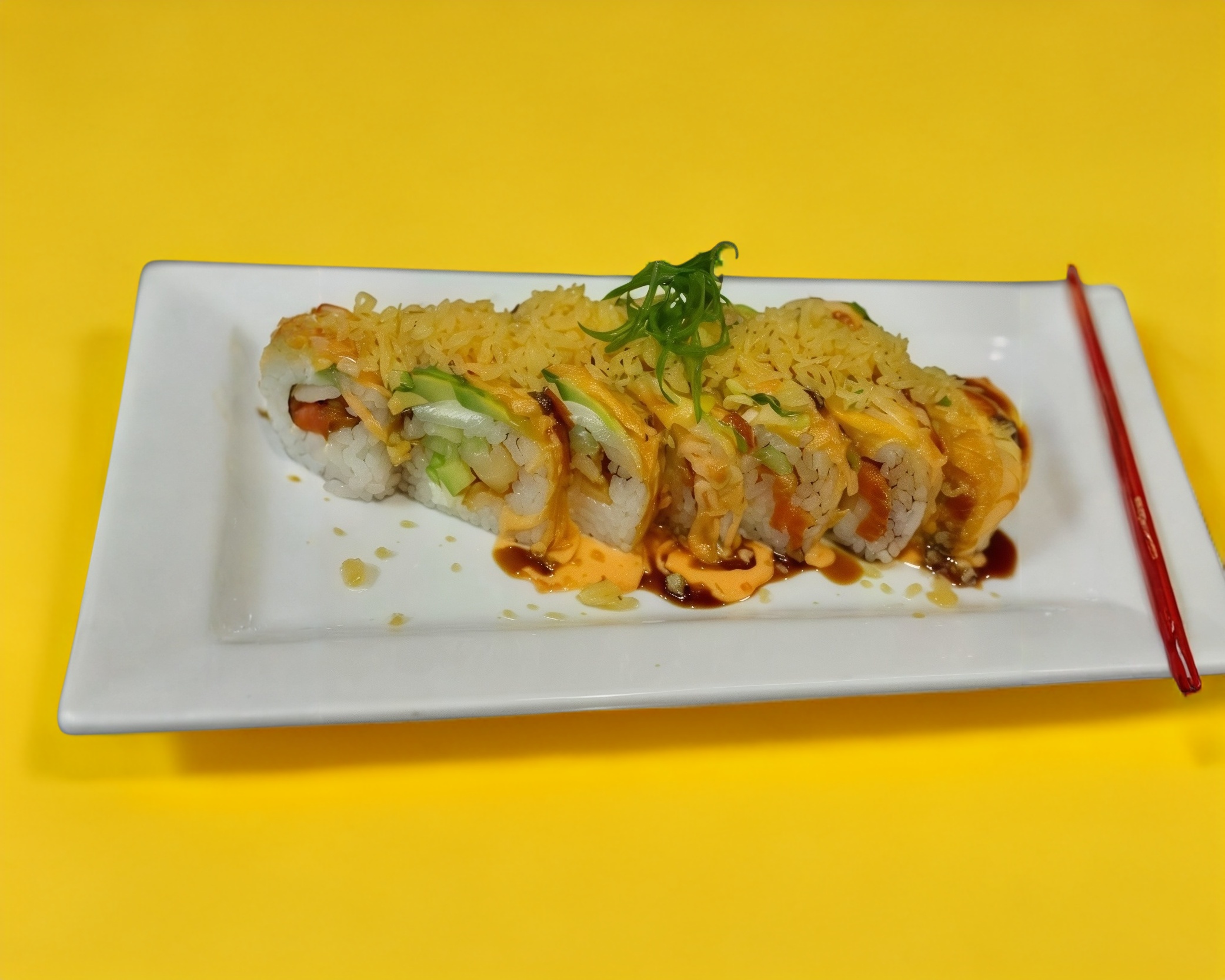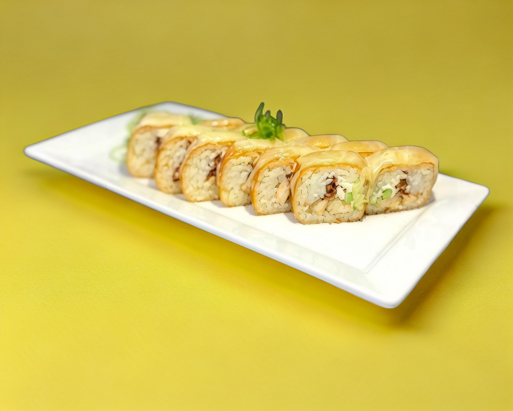 Rollo empanizado de Filadelfia, aguacate, pollo, res, gratinado de tocino, bañado con aderezo de chile verde más cebollín.