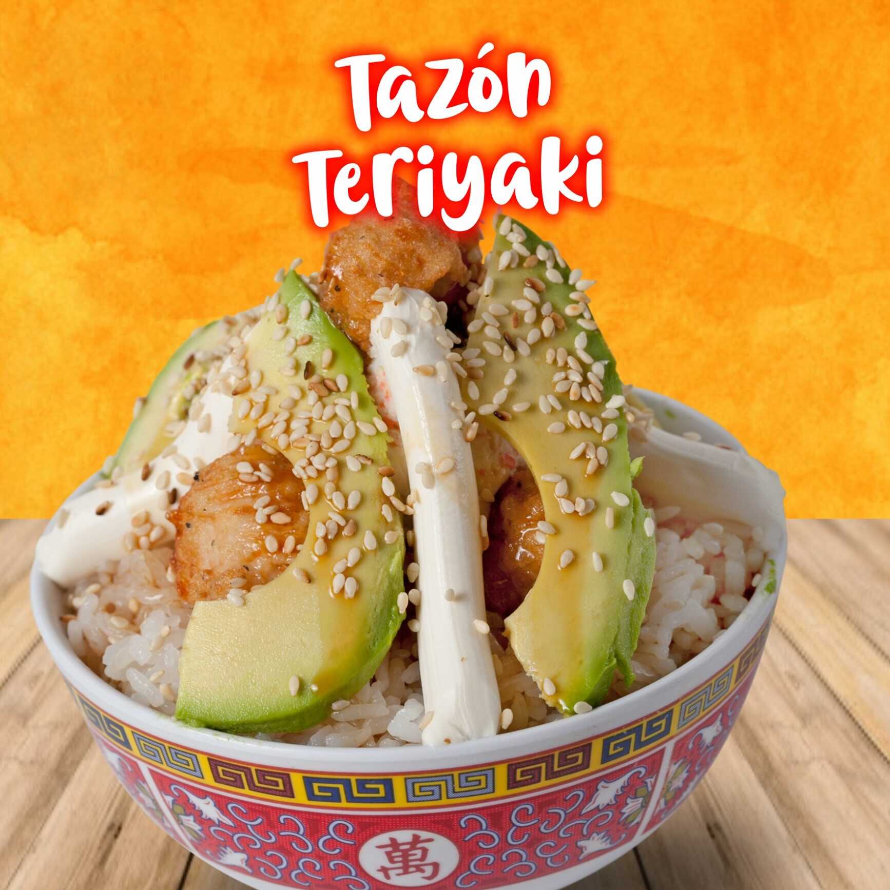 Arroz de sushi con ensalada tampico, pollo capeado, queso philadelphia y aguacate, bañado con salsa teriyaki y espolvoreado con ajonjolí.