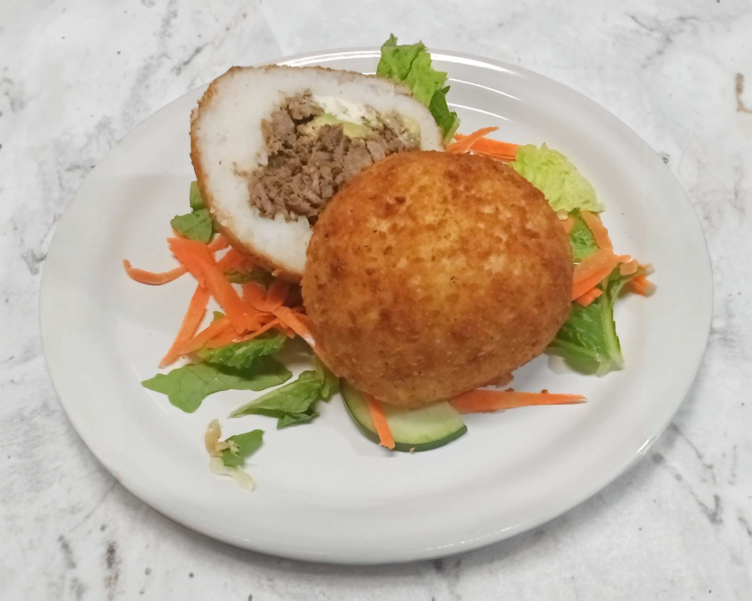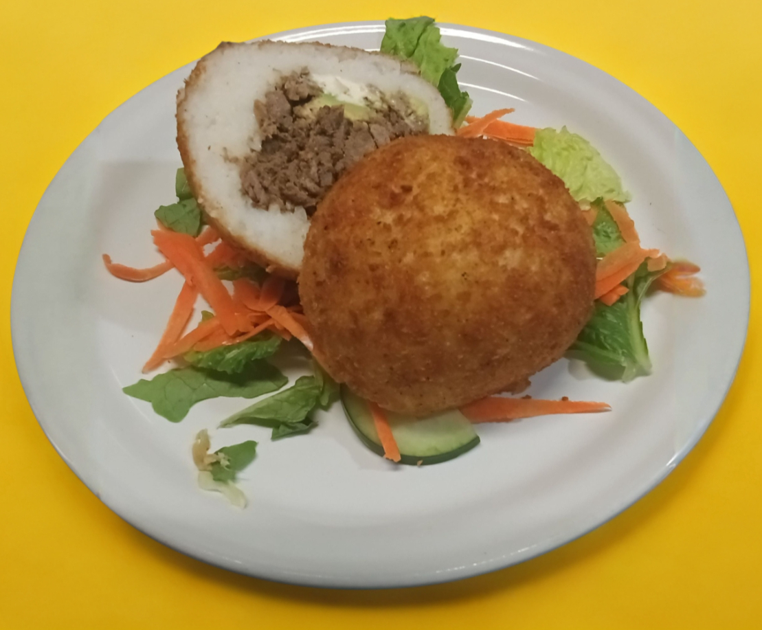 Pollo, res, aguacate, forrados con chiles güeros gratinados.