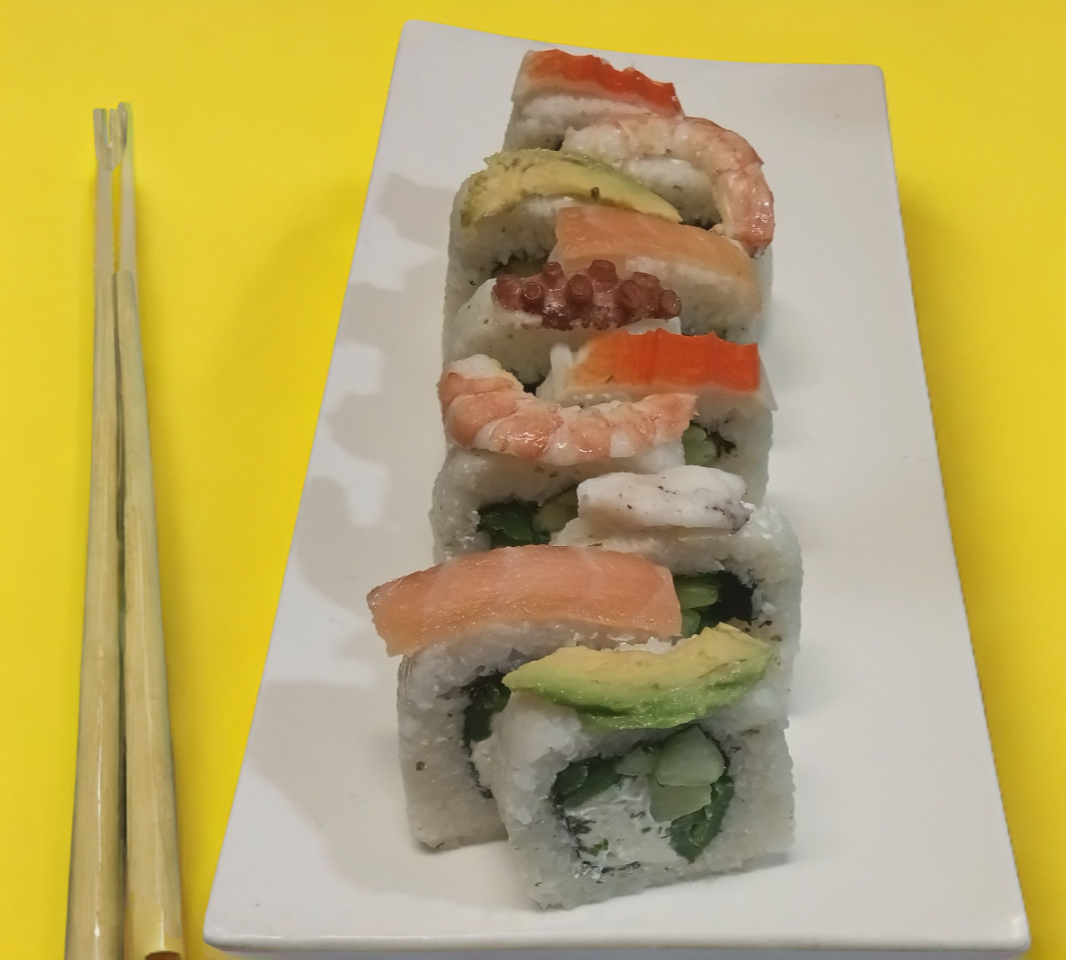 Philadelphia, pepino, chiles toreados, forrado de salmón, pulpo, camarón, cangrejo y aguacate.