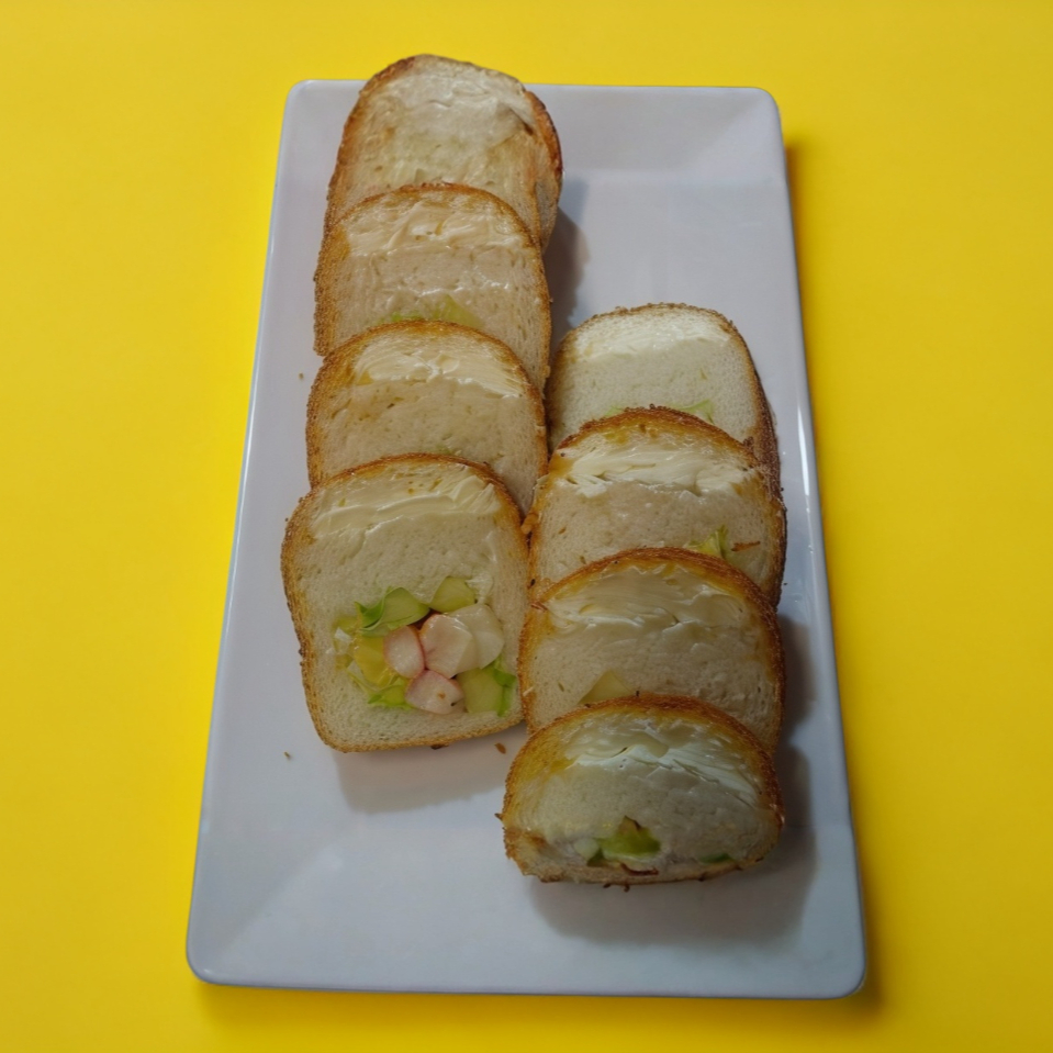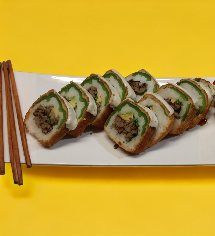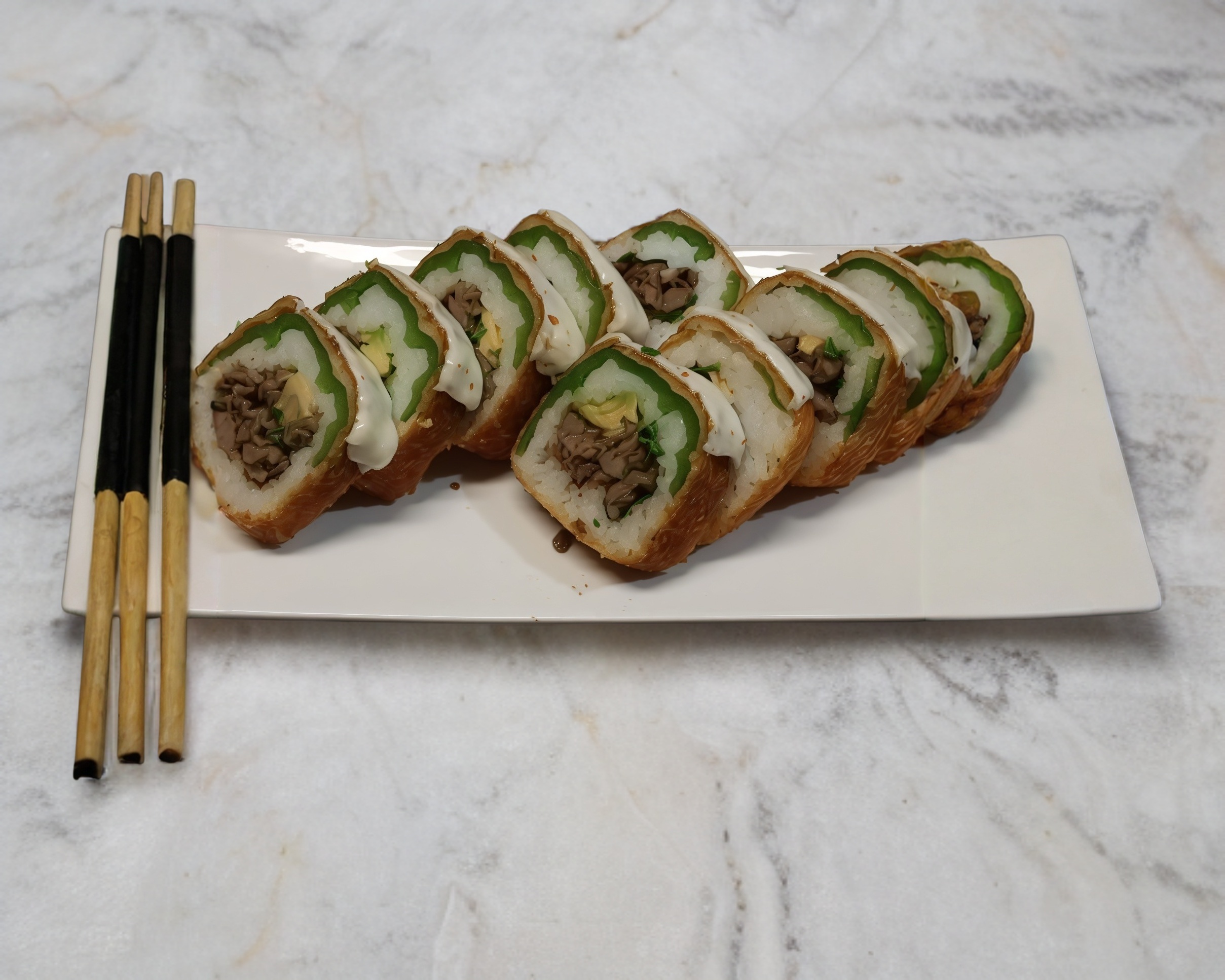 Pepino, aguacate, camarón forrado de philadelphia y flamin hot.
