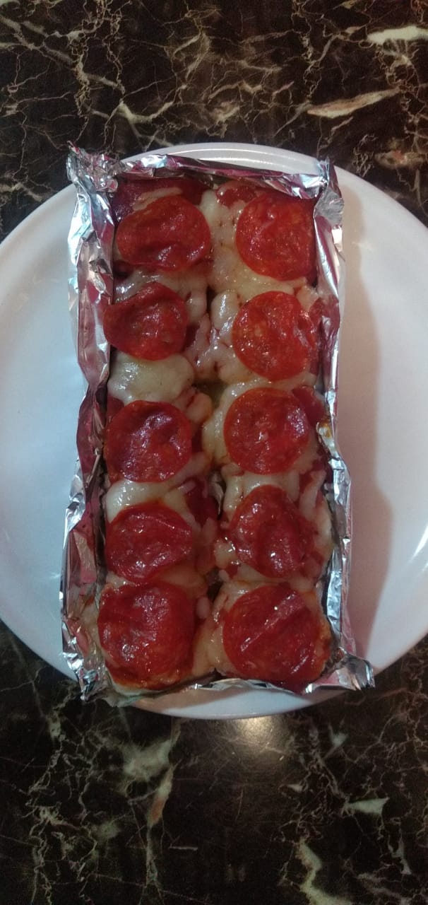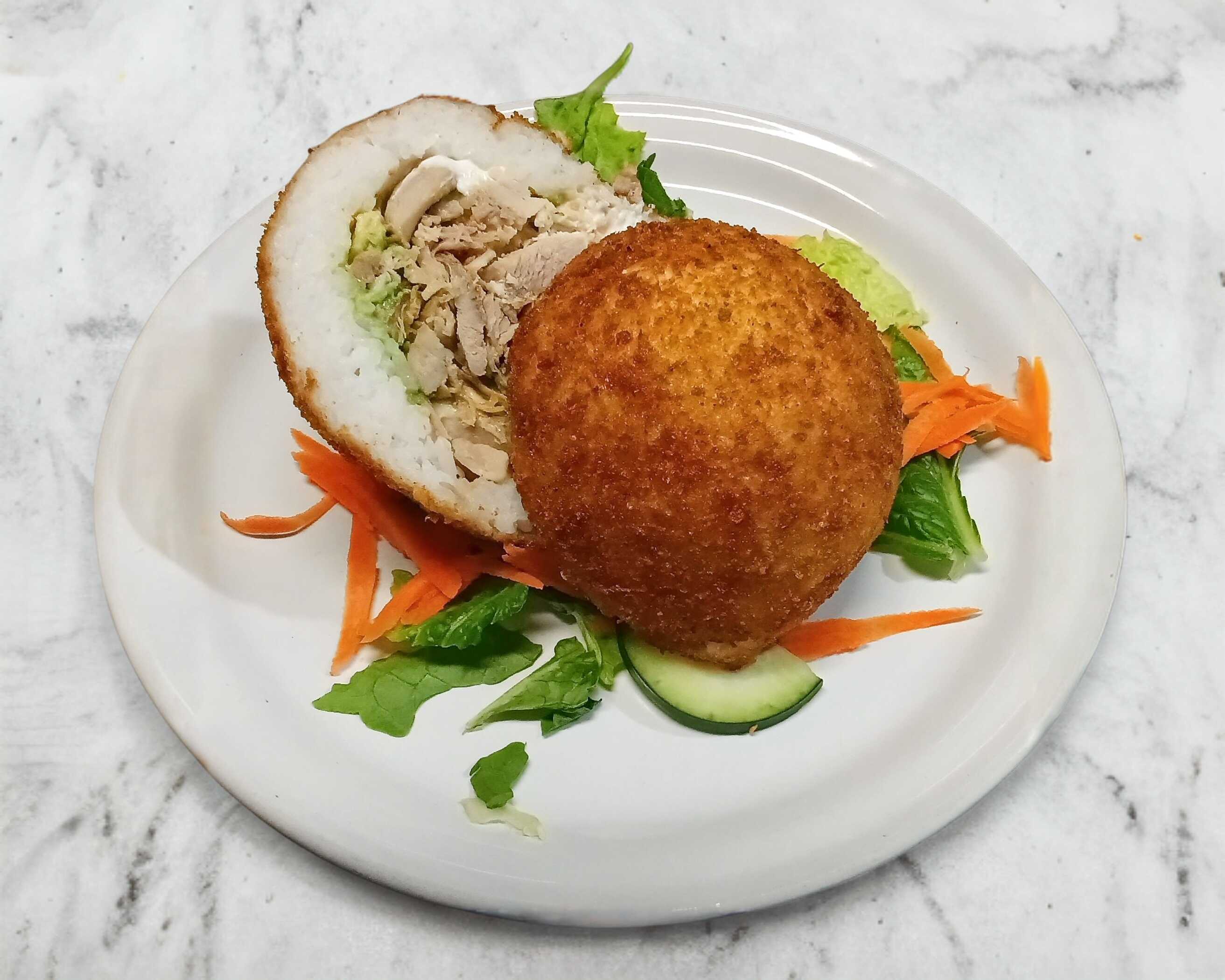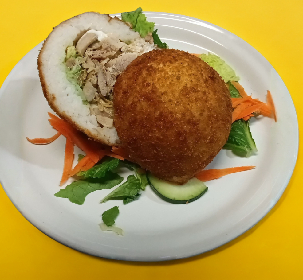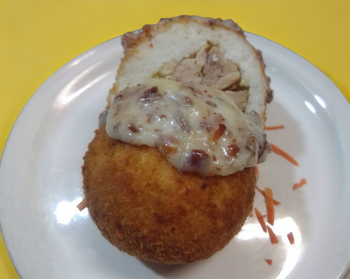 Pepino, aguacate, pollo y esta forrado con tocino gratinado.