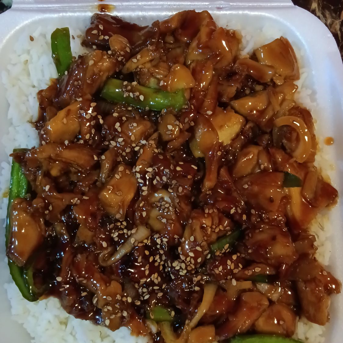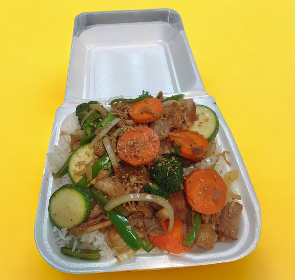 Teriyaki pollo, yakimeshi, 1 rollo de cangrejo empanizado y un rollo de philadelphia.