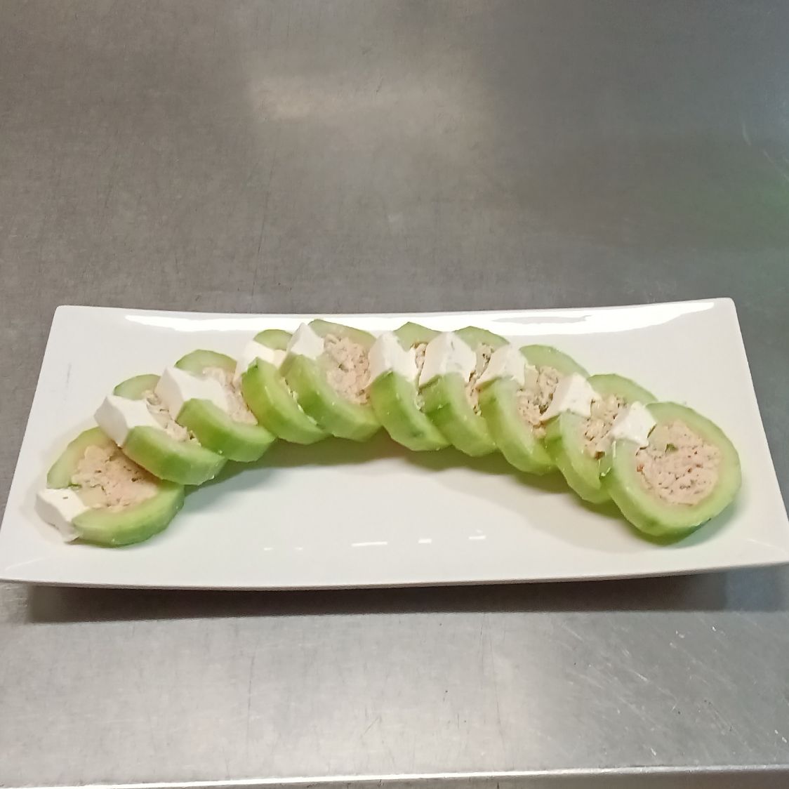 Pepino, aguacate y camarón, forrado de philadelphia.