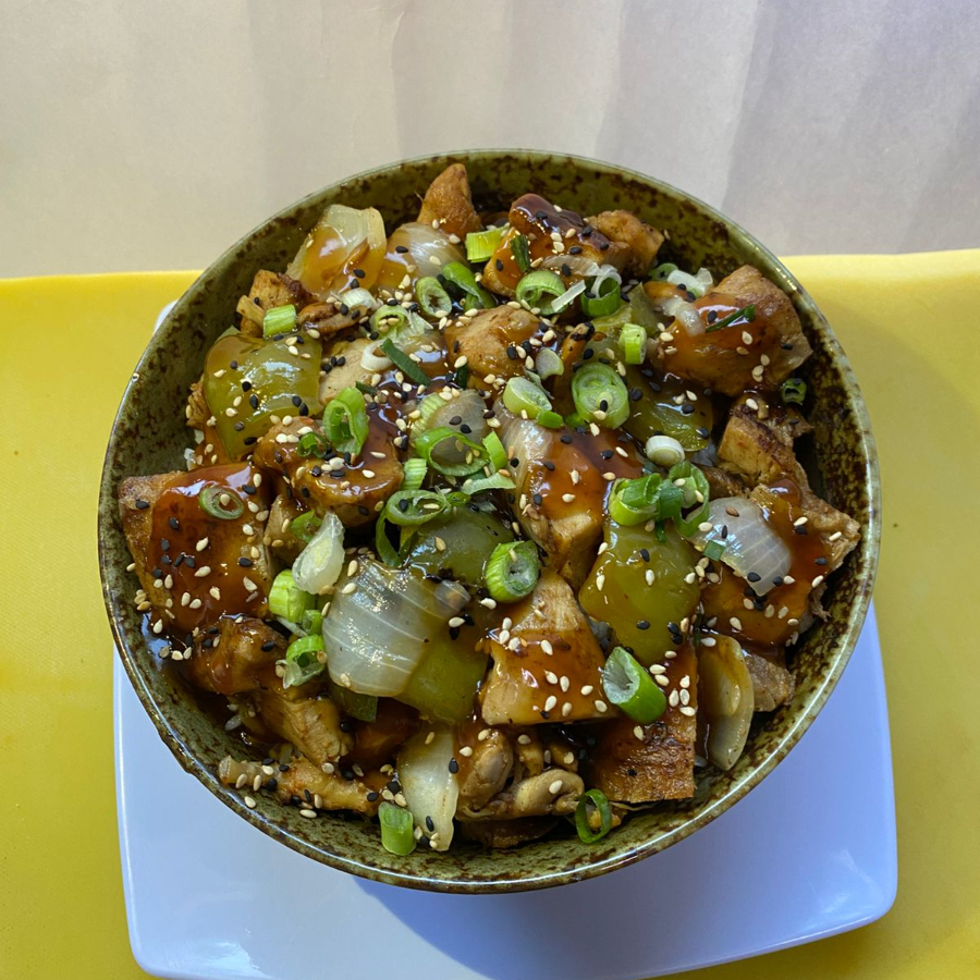 Pollo a la plancha salteado con morron verde y cebolla blanca, montado en una cama de arroz blanco, bañado en salsa teriyaki, coronado con cebollin y ajonjoli.