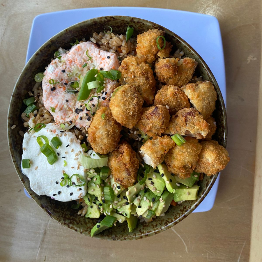 Arroz frito salteado con verduras, acompañado de aguacate, queso philadelfia, tampico y pollo empanizado