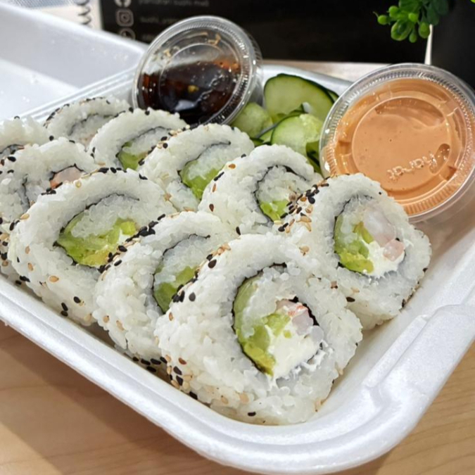 Relleno de queso philadelphia, aguacate, camaron, salmon, surimi. Alga por fuera, empanizado y bañado en salsa chipotle, siracha y teriyaki.