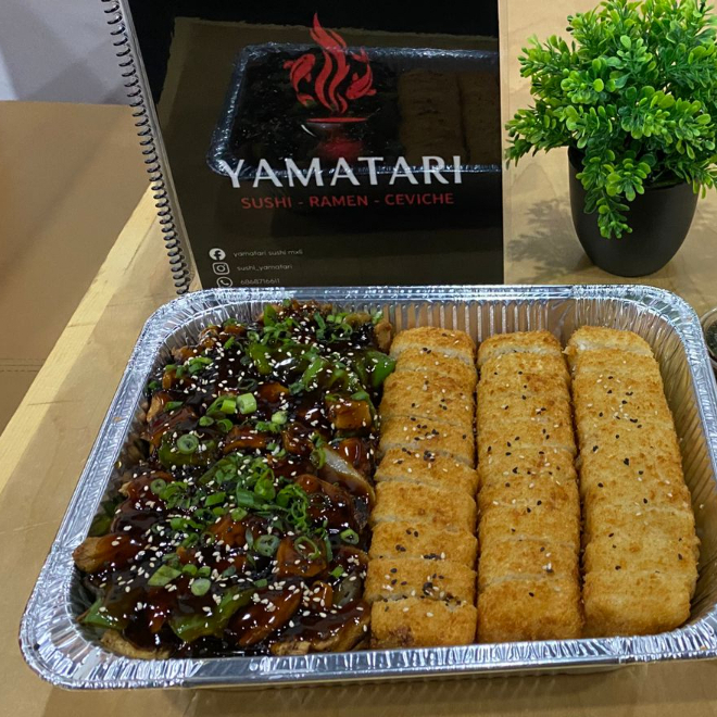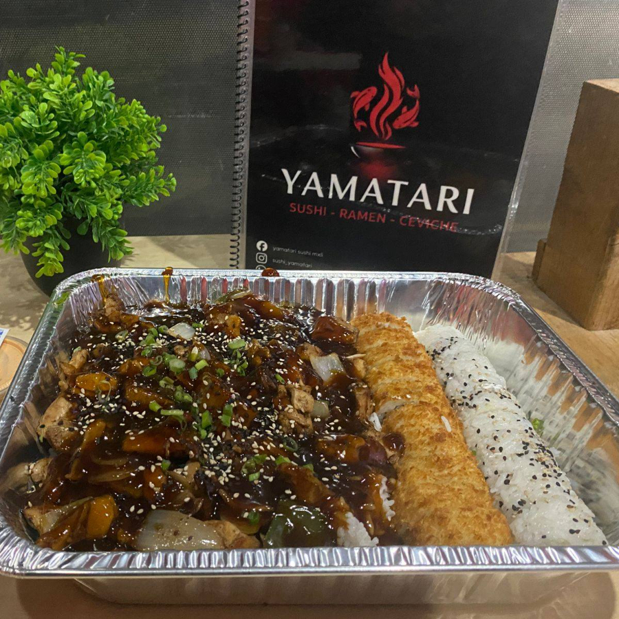 Charola con teriyaki, dos porciones de yakisoba de pollo, 3 rollos empanizados1 de pollo, 1 de res y 1 de camaron, con toping de tampico, aguacate y zanahoria salseado con siracha y chipotle.