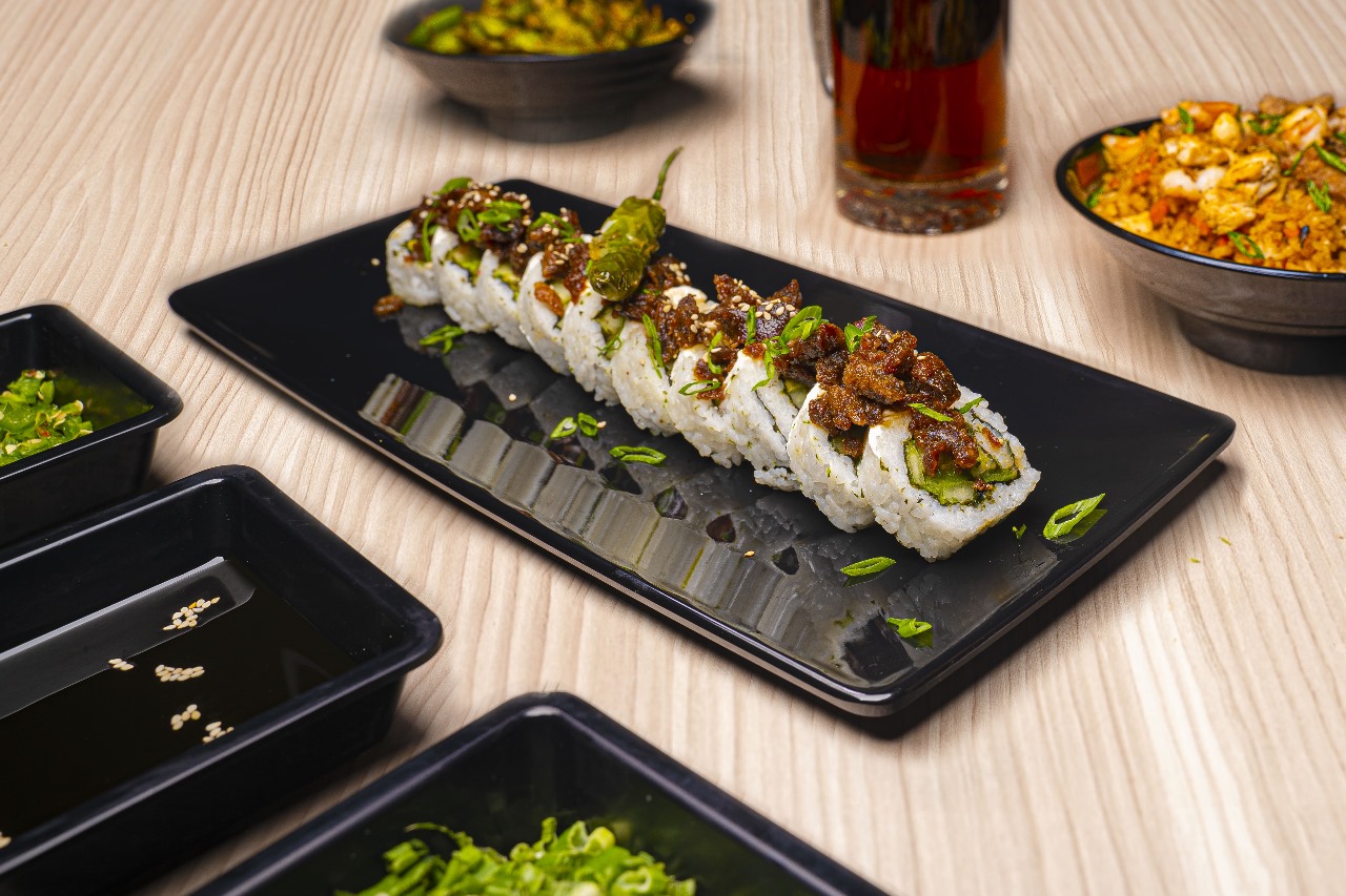 Pepino, aguacate y chile toreado por dentro. Por fuera queso crema, coronado con carne Mongolia (60gr).