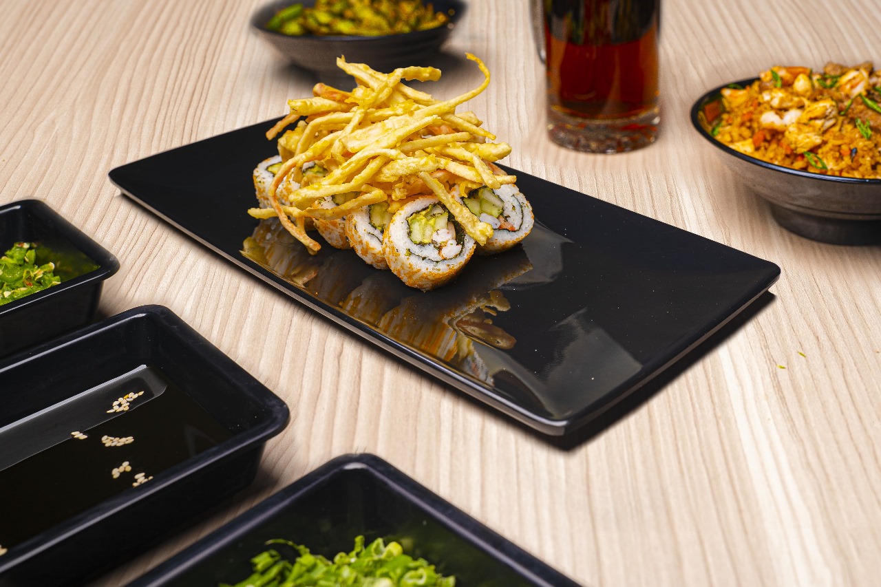 Lleva camarón (30gr) en tempura con aderezo roca y acompañado de aguacate, bañado con salsa samurai y espolvoreado con ajonjolí negro.
