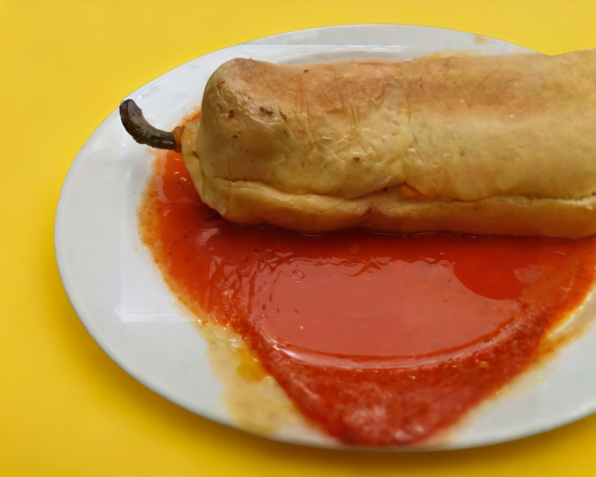 Chicharrón suave cocido en salsa roja de chile y jitomate, servido en tortilla.