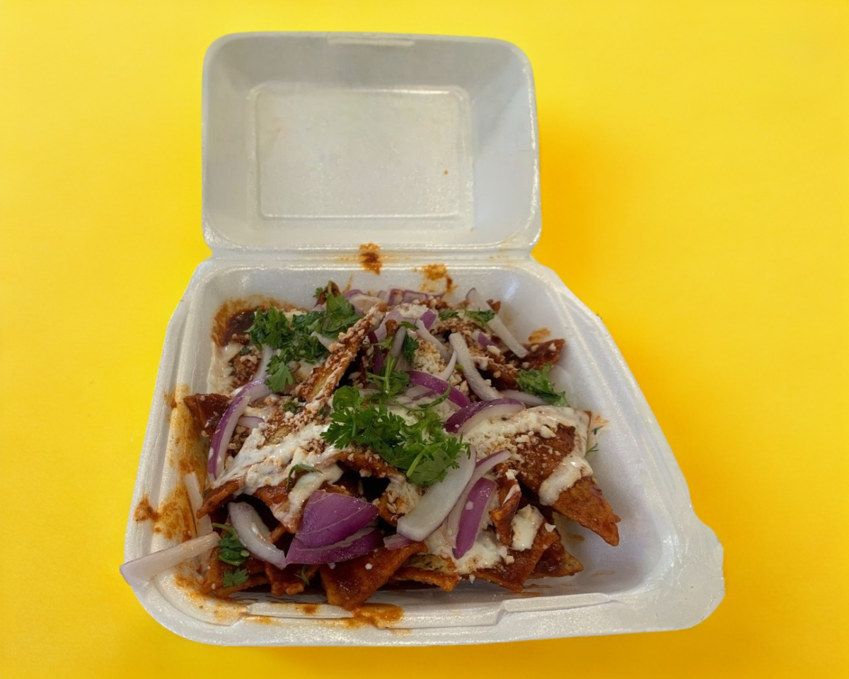 Tortilla frita bañada en salsa roja, con queso y crema.