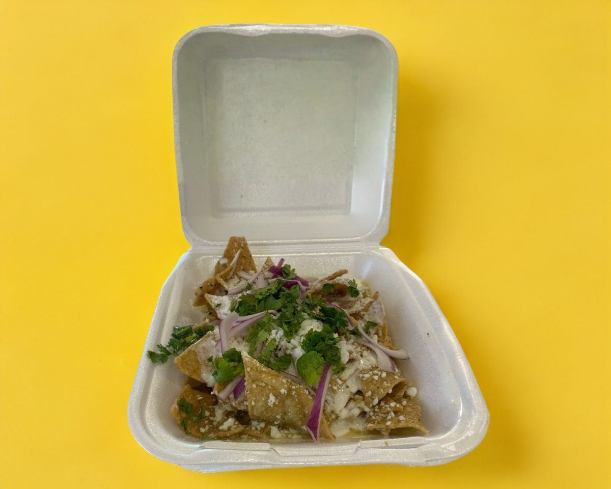 Tortilla frita bañada en salsa verde, con queso y crema.