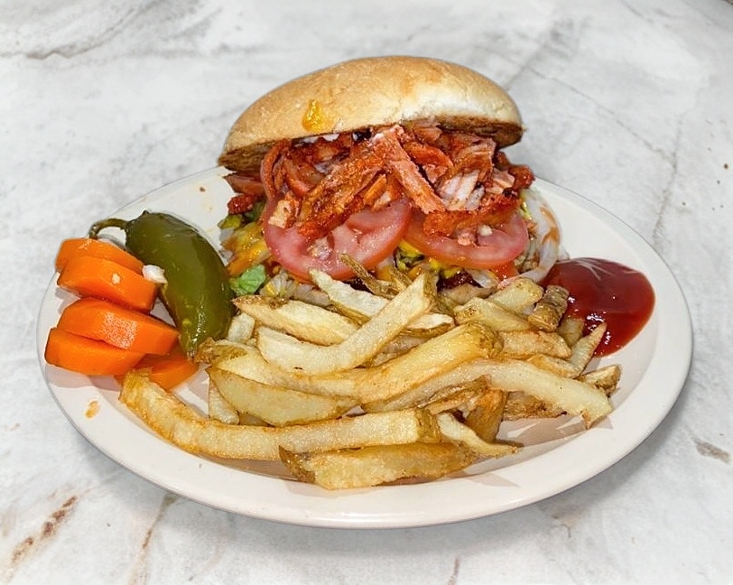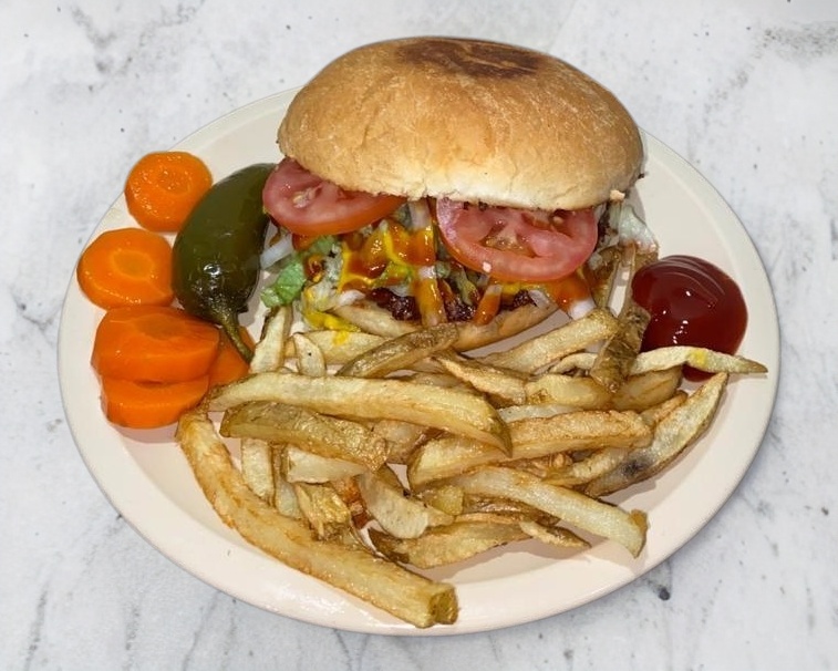 1 Hamburguesa Doble carne de res ( 100 gramos por cada una ) lechuga tomate cebolla catsup mayonesa queso tipo americano +1 Agua de Ponche (500 ml ) presentacion botella