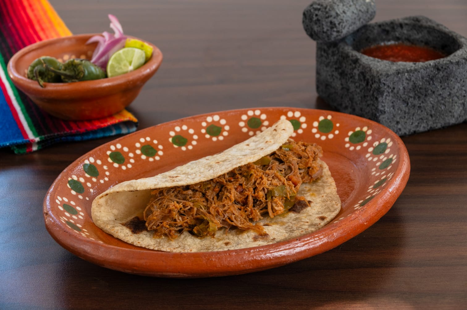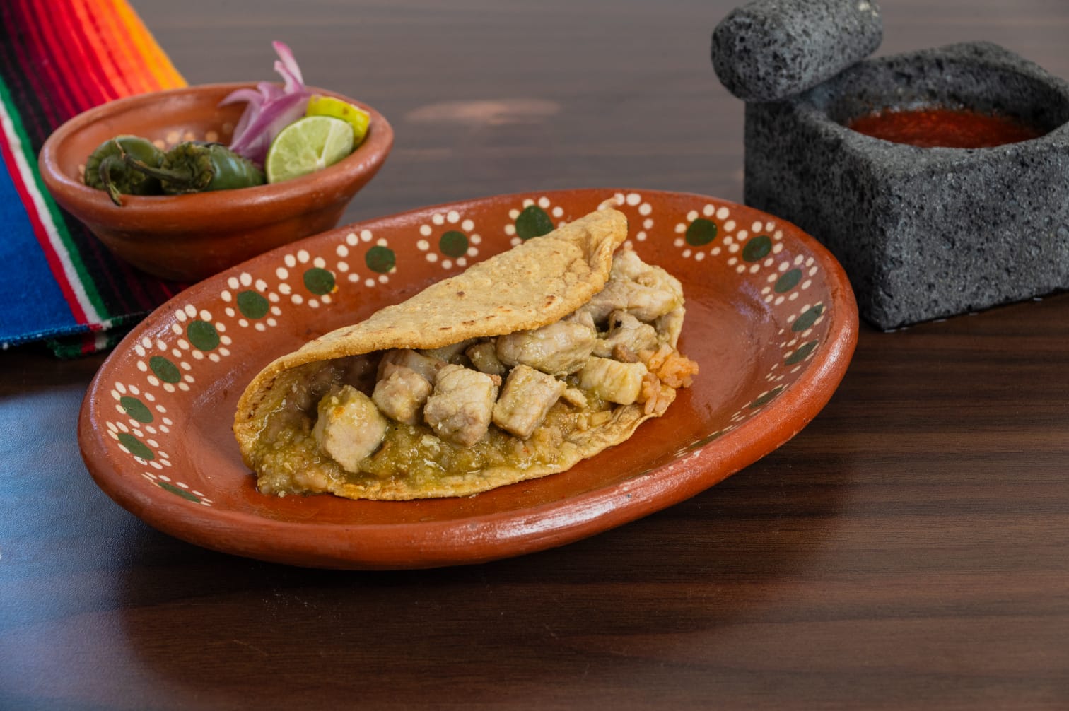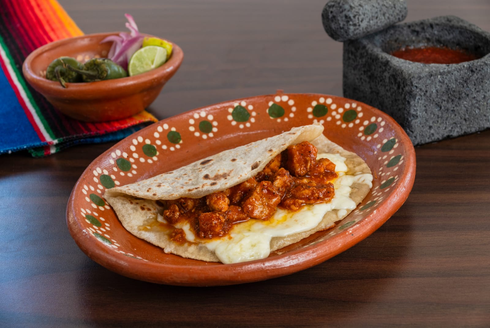 Una quesadilla rellena de carne de cerdo en salsa roja.