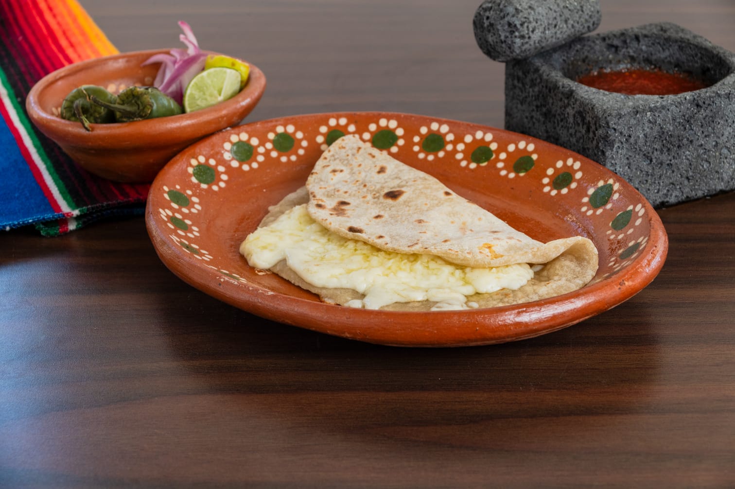 Una quesadilla de tortilla de maíz o harina, rellena de queso.