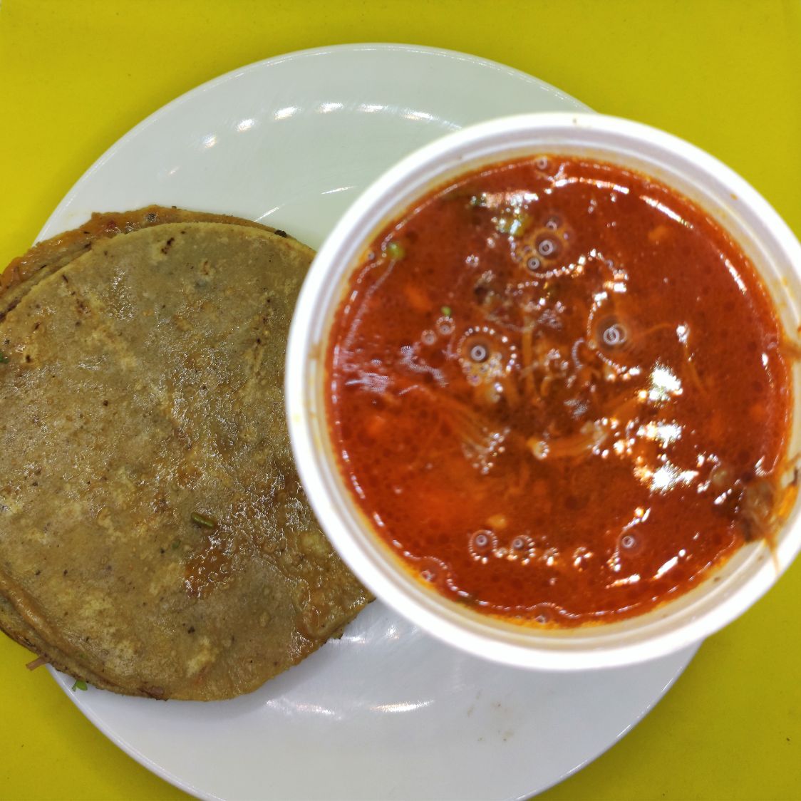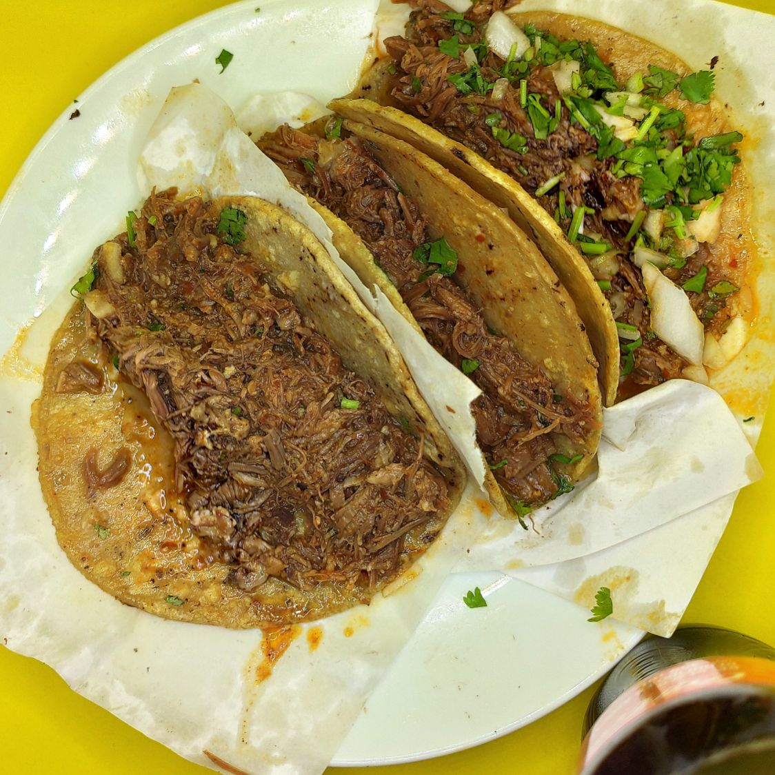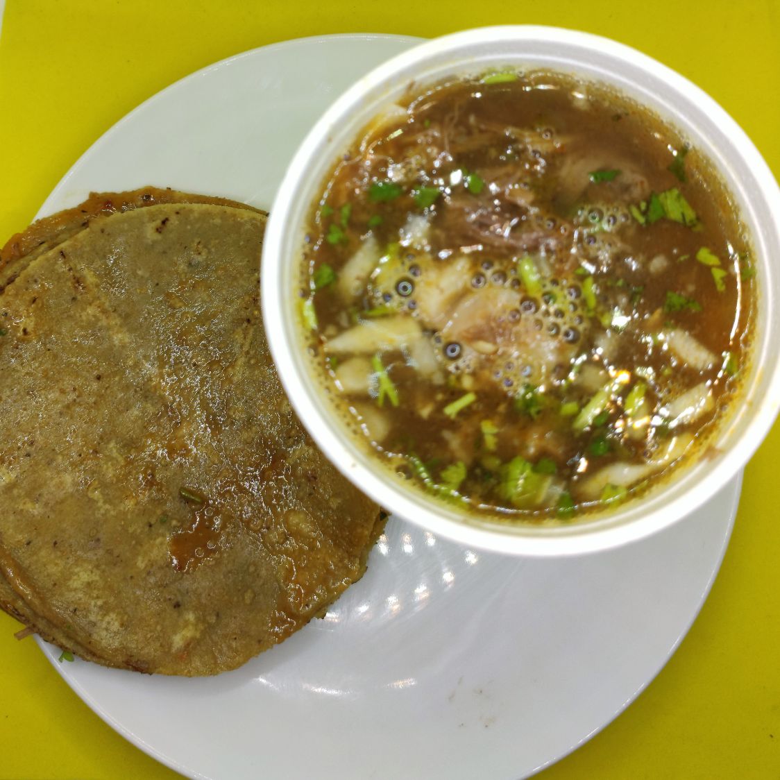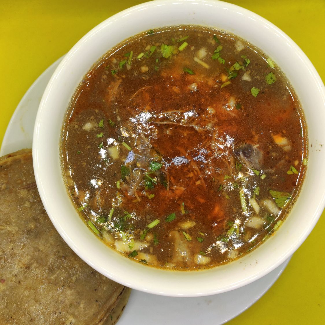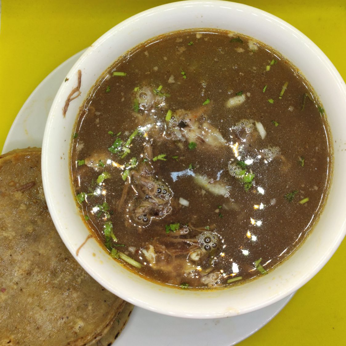 Vaso de 12 oz. con jugo y carne de borrego adobado, acompañado de 4 tortillas de maíz calentadas al vapor. Acompañado de repollo, cebolla y cilantro, limón, salsa roja y verde.