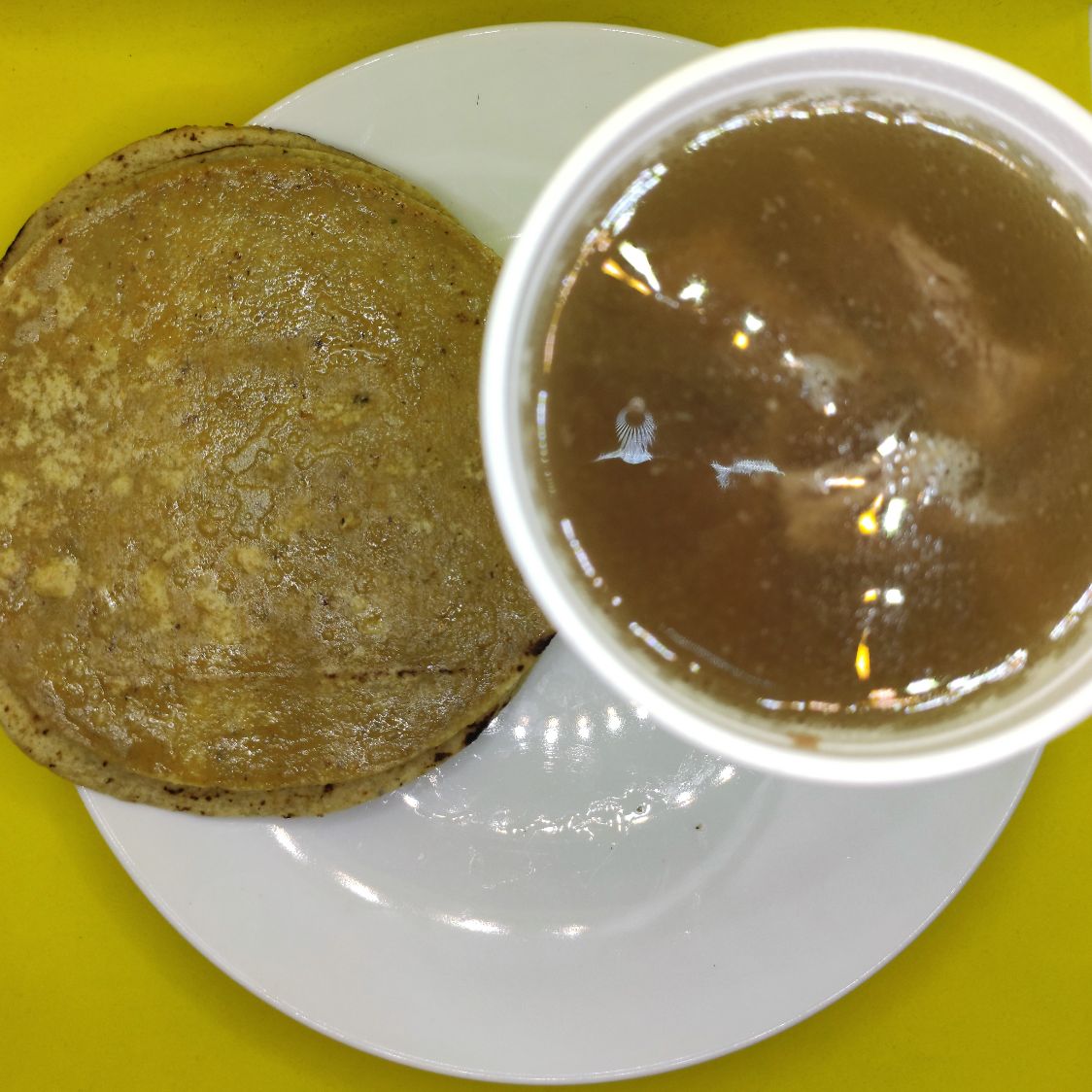 Vaso de 1/2 L. con jugo y carne de carne de res natural, acompañado de 7 tortillas de maíz calentadas al vapor. Acompañado de repollo, cebolla y cilantro, limón, salsa roja y verde.