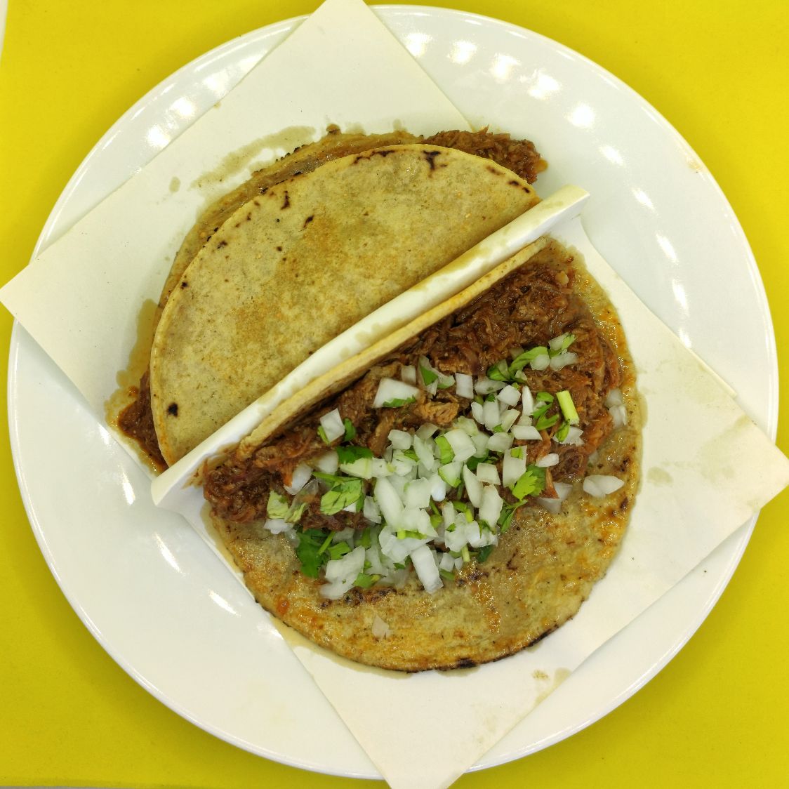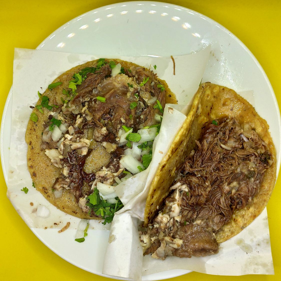 Taco de tortilla de maíz y carne de borrego adobado calentado al vapor. Acompañado de repollo, cebolla y cilantro, limón, salsa roja y verde.