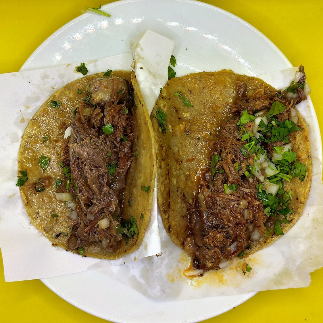 Taco de tortilla de maíz y carne de cabeza de res natural calentado al vapor. Acompañado de repollo, cebolla y cilantro, limón, salsa roja y verde.