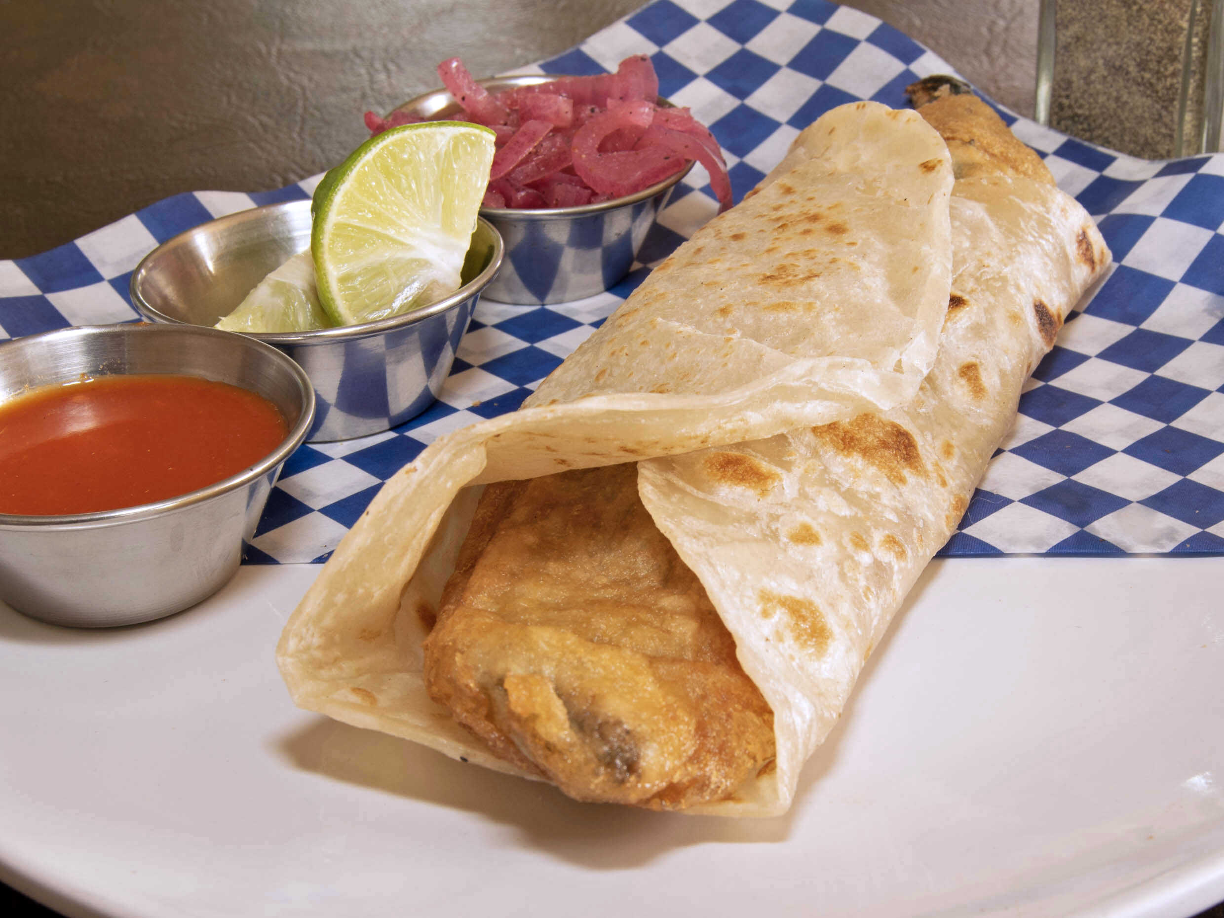 Chile relleno de queso montado en tortilla de harina o maíz dependiendo de la elección de el cliente.