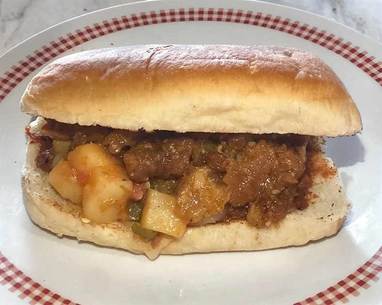 Papa maya, machaca, morrón, cebolla morada, queso gratinado y huevo en torta.