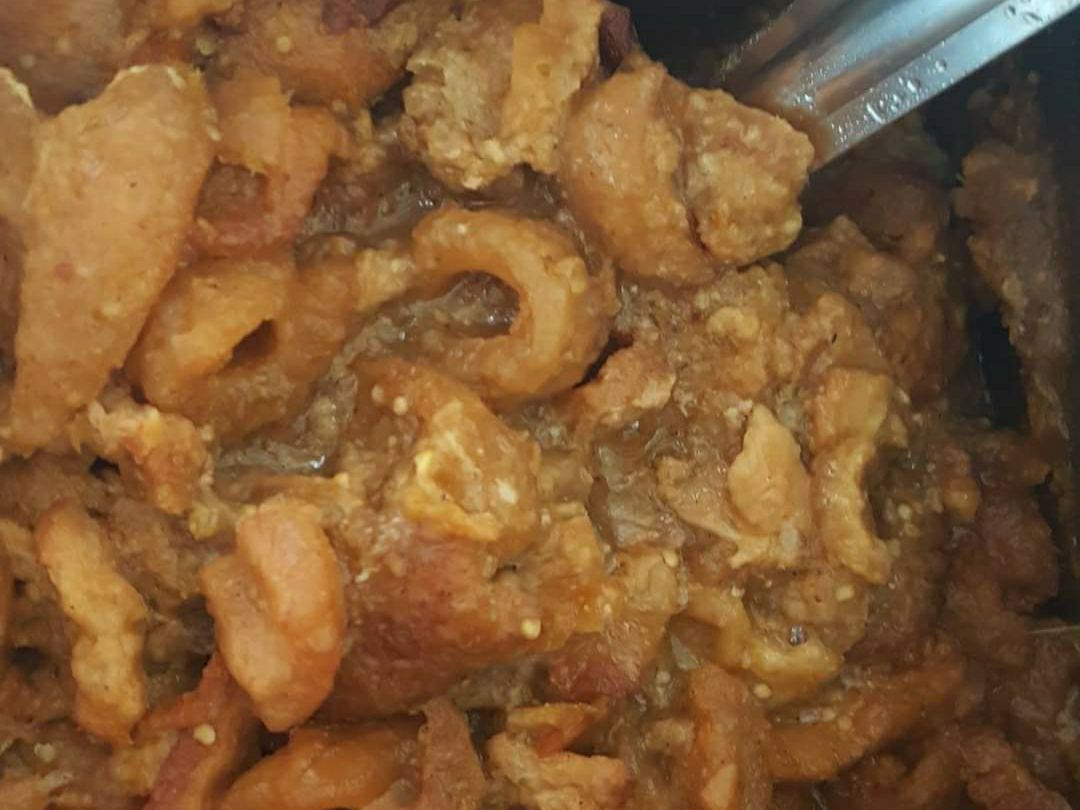 Asientos de chicharrón, queso gratinado, frijoles refritos, 1 guisado, 1/2 chile relleno y 1 huevo en torta o estrellado.