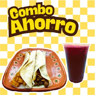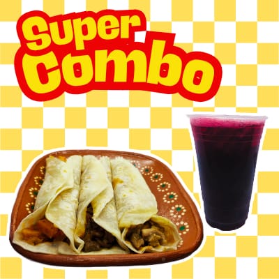 3 tacos de tortilla de harina más un agua fresca de medio litro