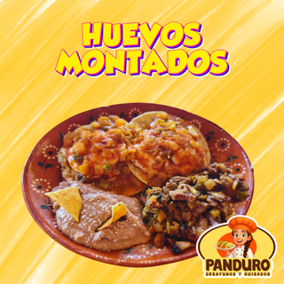 Dos huevos estrellados montados en tortilla de maiz bañados en salsa, con frijoles y el guisado de tu eleccion