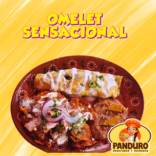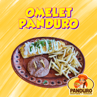 Omellette de huevo relleno de queso y el guisado de tu preferencia acompañado de papas fritas, frijoles
