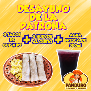 3 Tacos de Guisado a Elegir, 2 huevos al gusto, 1 agua fresca de 1/2 litro