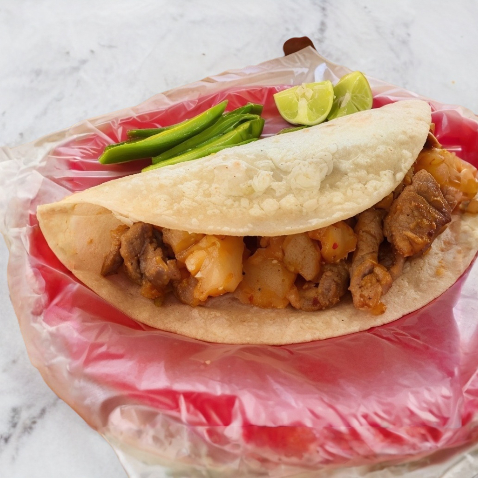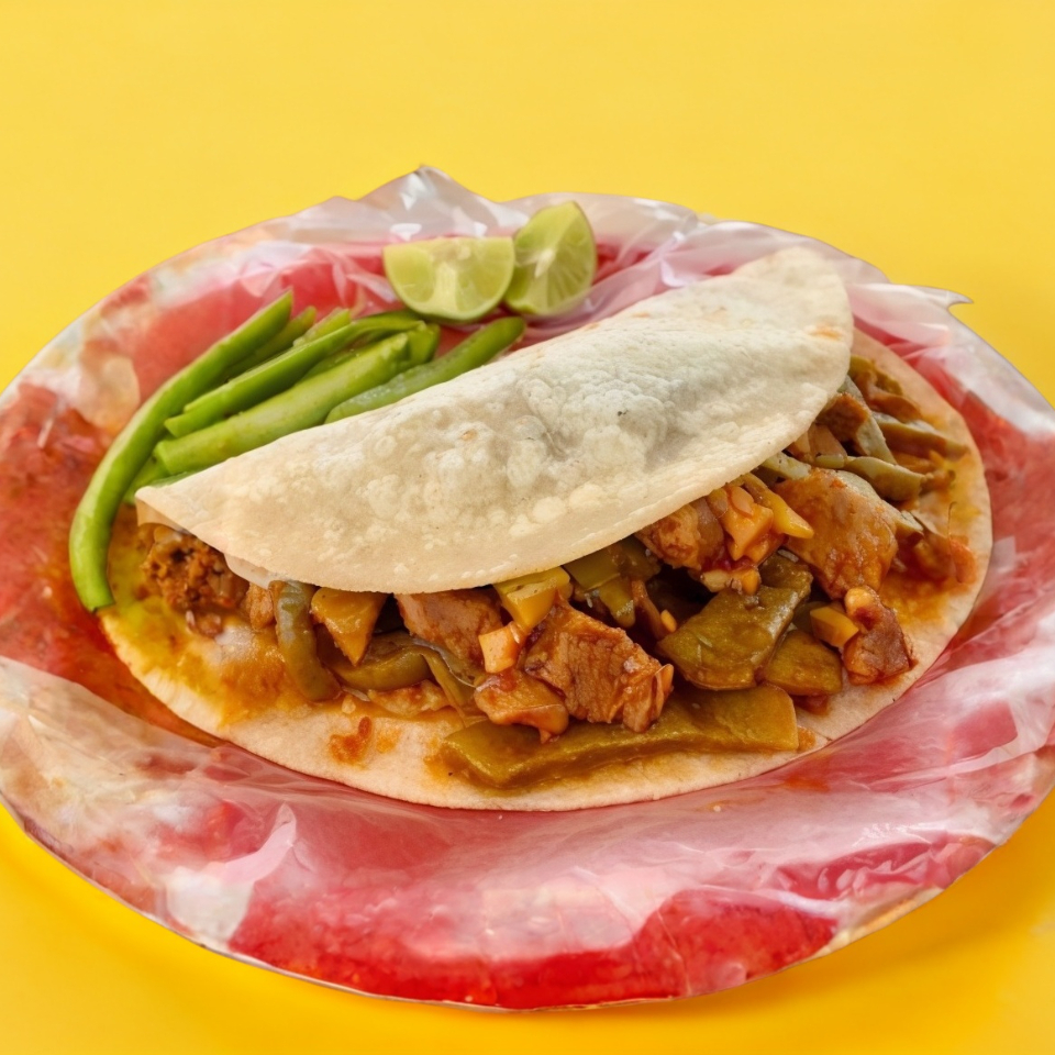 Taco que combina chile relleno con guisado a elegir, una mezcla sabrosa y contundente.