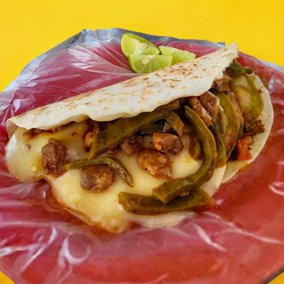 Quesadilla rellena con chile relleno y guisado a elegir, perfecta para antojos grandes.