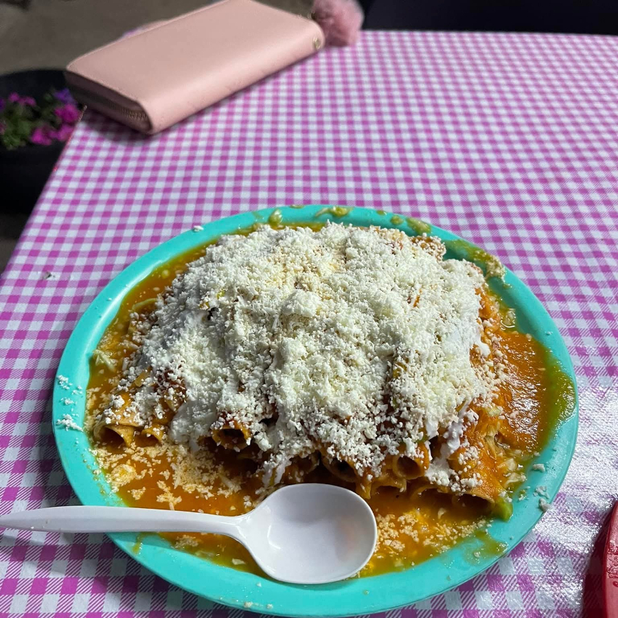 Tacos dorados de carne deshebrada y por fuera lechuga queso crema aguacate y cebolla morada
