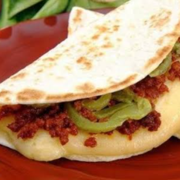quesadilla con guiso especial (bisteck con frijol entero em salsa de la casa