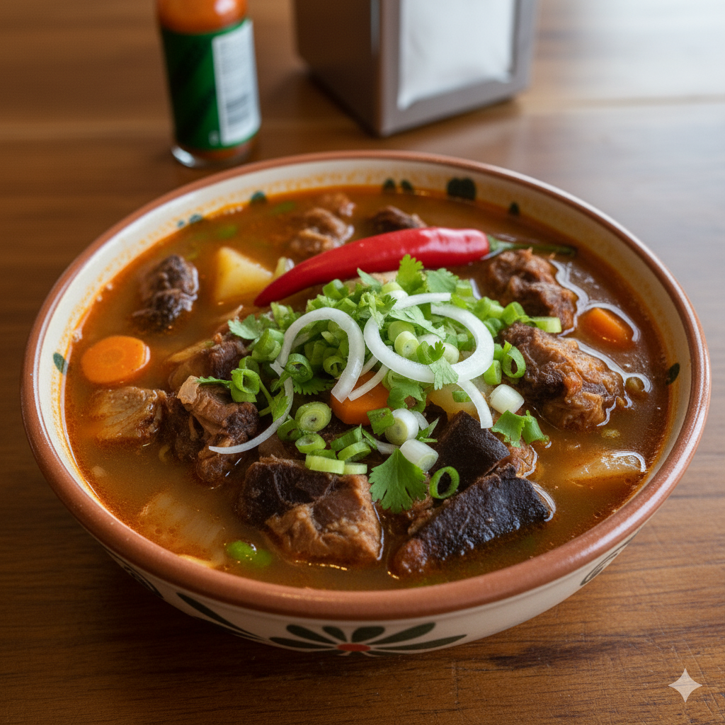 Un caldo tradicional de carne de mantarraya y camarón, servido con verduras.