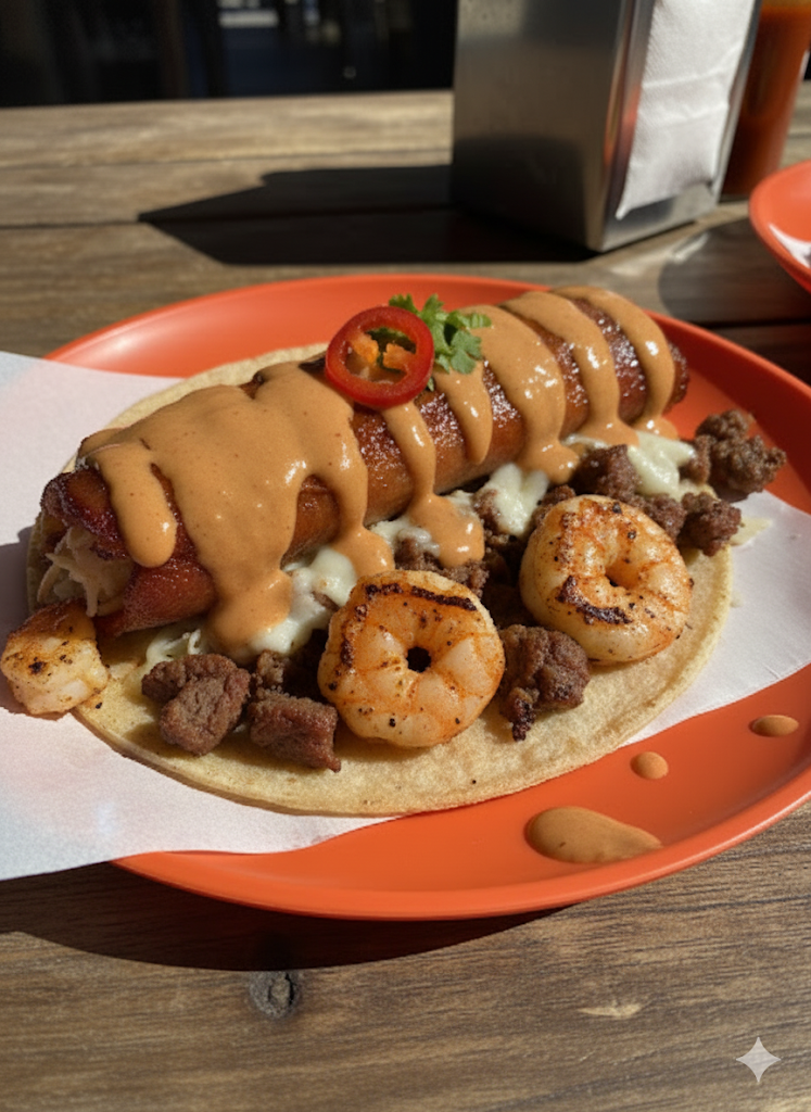Un taco con carne, queso y camarón, bañado en salsa diabla o crema chipotle.
