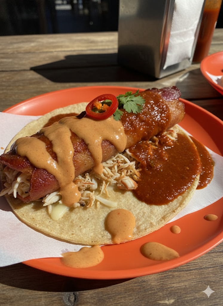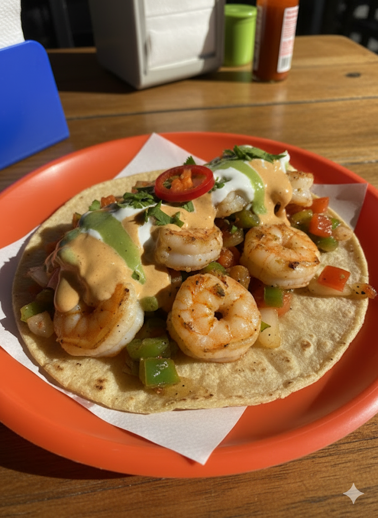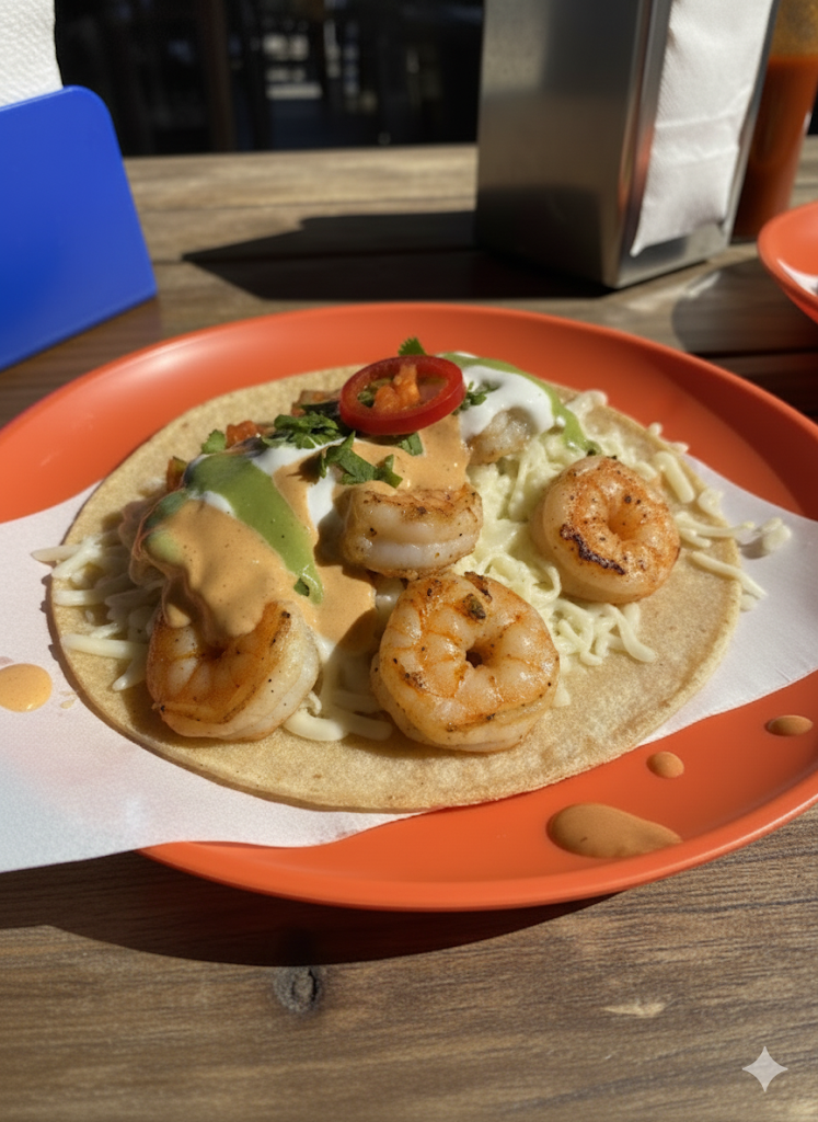 Un taco con queso y camarón, bañado en salsa diabla o crema chipotle.