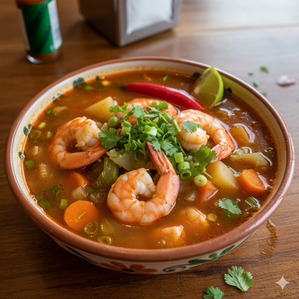 Un caldo de camarón con verduras, perfecto para un día frío.