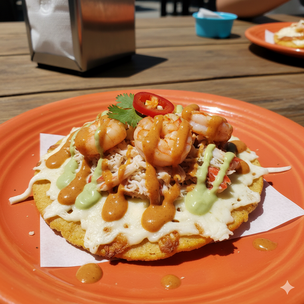 Una tostada con queso y camarón, bañada en salsa diabla o crema chipotle.