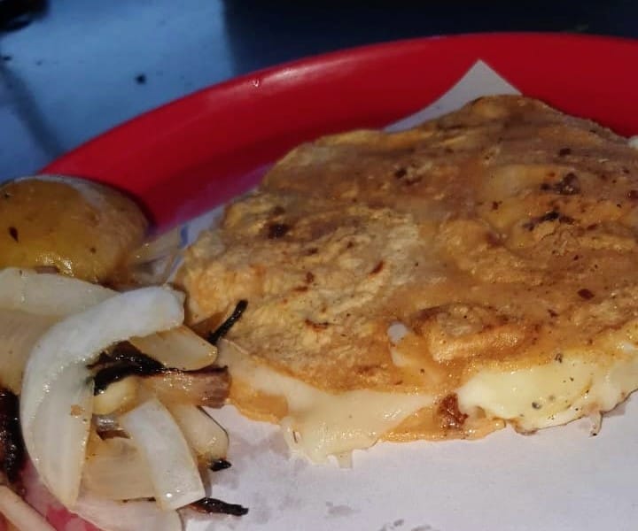 Quesadilla de doble tortilla de Maíz de 11 cm, con queso monterrey Jack y carne de bistec cocinada en comal choricero, con cilantro, cebolla, salsa verde o roja y guacamole, acompañado de cebolla guisada con una papá cambray.