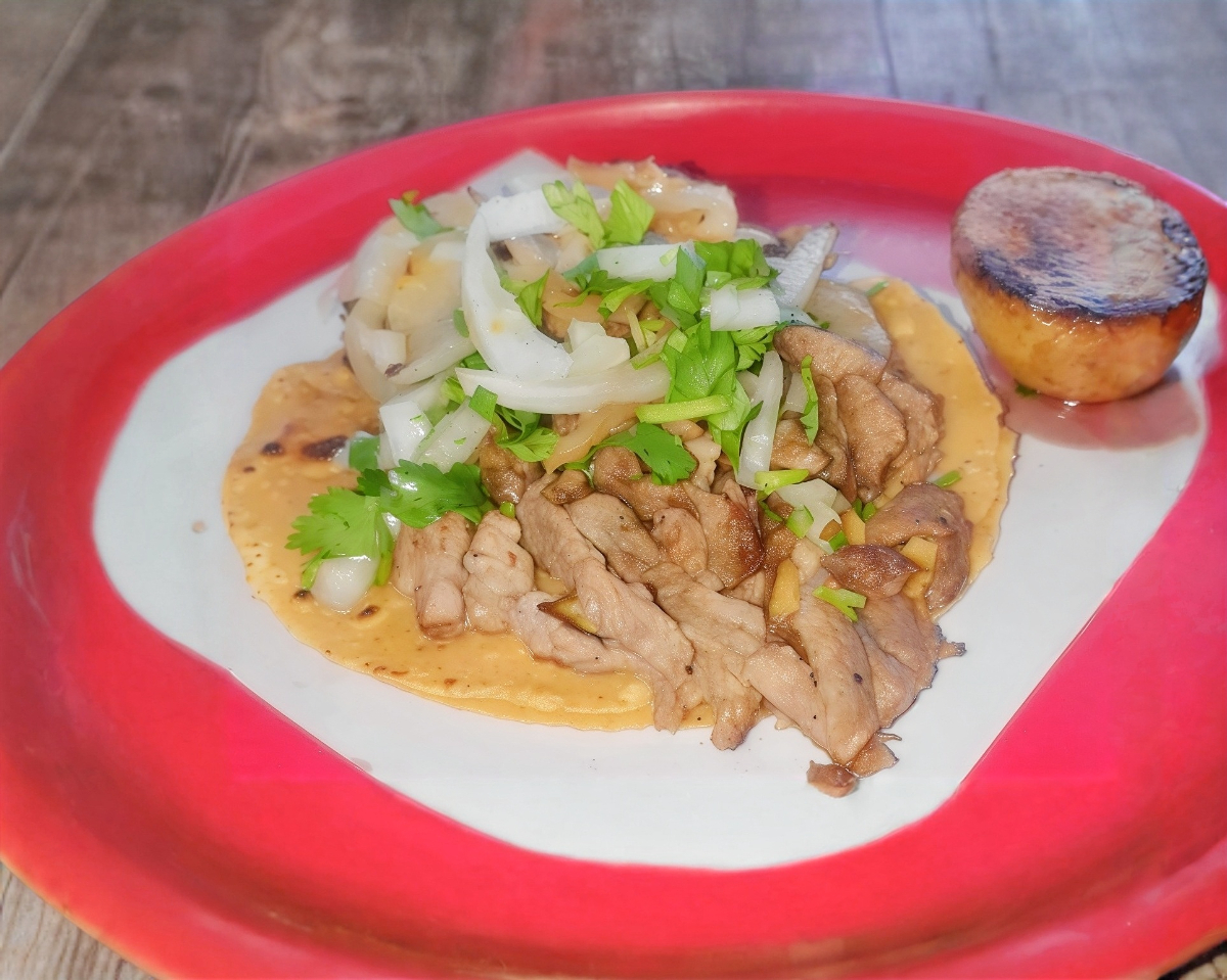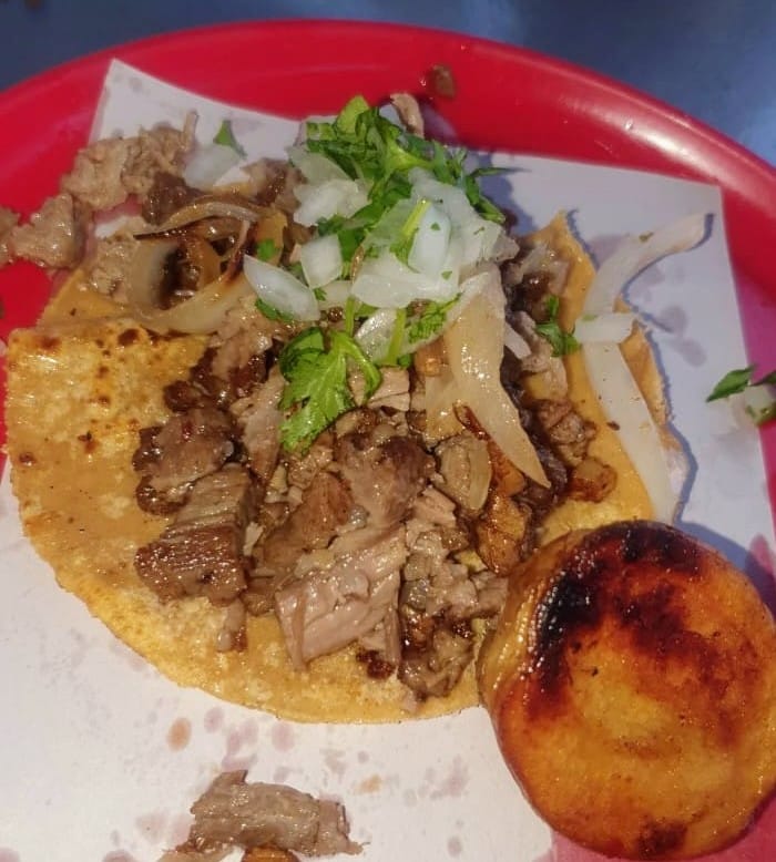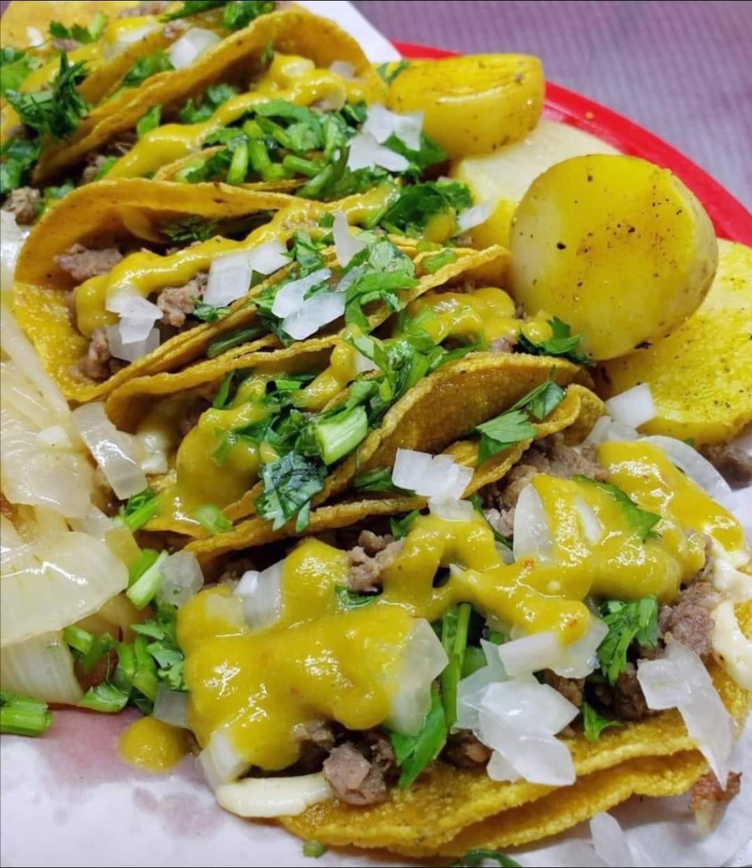 Carne de adobada, cocinada en comal choricero, con doble tortilla de maiz de 11 cm, con cilantro, cebolla, salsa verde o roja y guacamole, acompañado de cebolla guisada con una papá cambray.