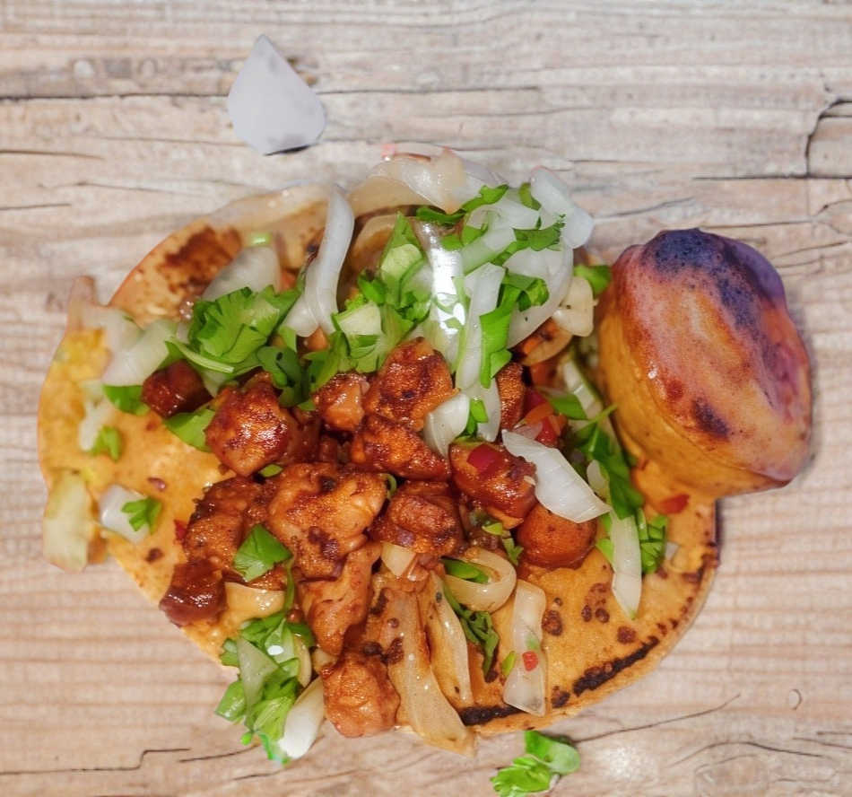 A elegir entre bistec, suadero y adobada, cocinada en comal choricero, con doble tortilla de maiz de 11 cm, con cilantro, cebolla, salsa verde o roja y guacamole, acompañado de cebolla guisada con una papá cambray.