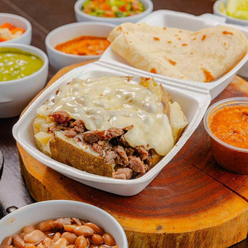 pap horneada con mantequilla ,carne queso y crema fundido, acompanada de tortillas