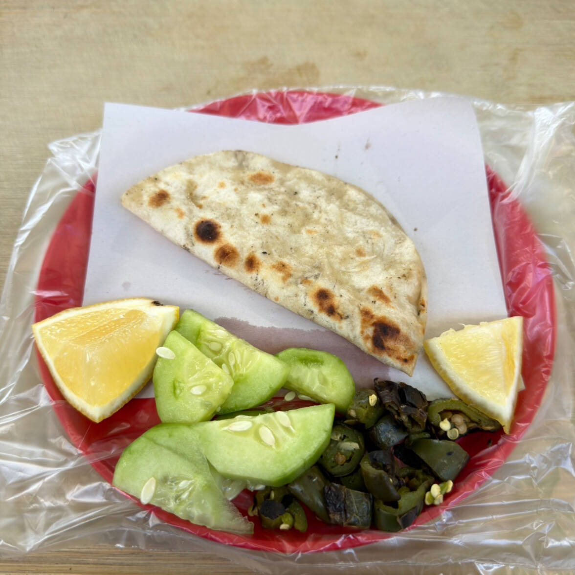 Tortilla taquera con queso, acompañada de diversas verduras y salsas (frijol, repollo, salsa bandera, guacamole, limón, pepino, chiles asados, rabano).
