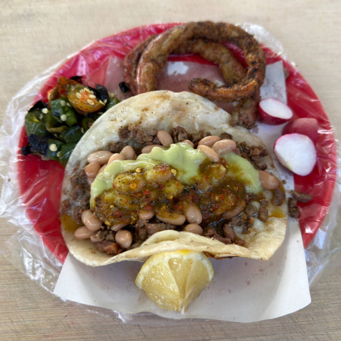 Tortilla taquera con proteína de su preferencia, acompañado de diversas verduras y salsas (frijol, repollo, salsa bandera, guacamole, limón, pepino, chiles asados, rabano).